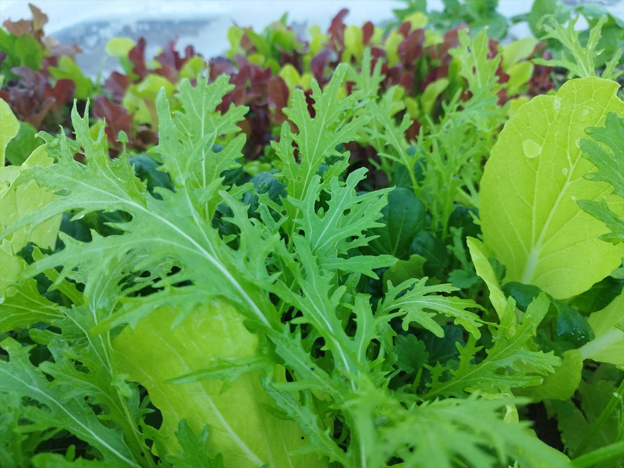 ベビーリーフは、何種類かの異なる葉野菜の若い葉をミックスしたもの。市販のタネはメーカーによって含まれる葉野菜の種類が異なり、見た目も変わります。