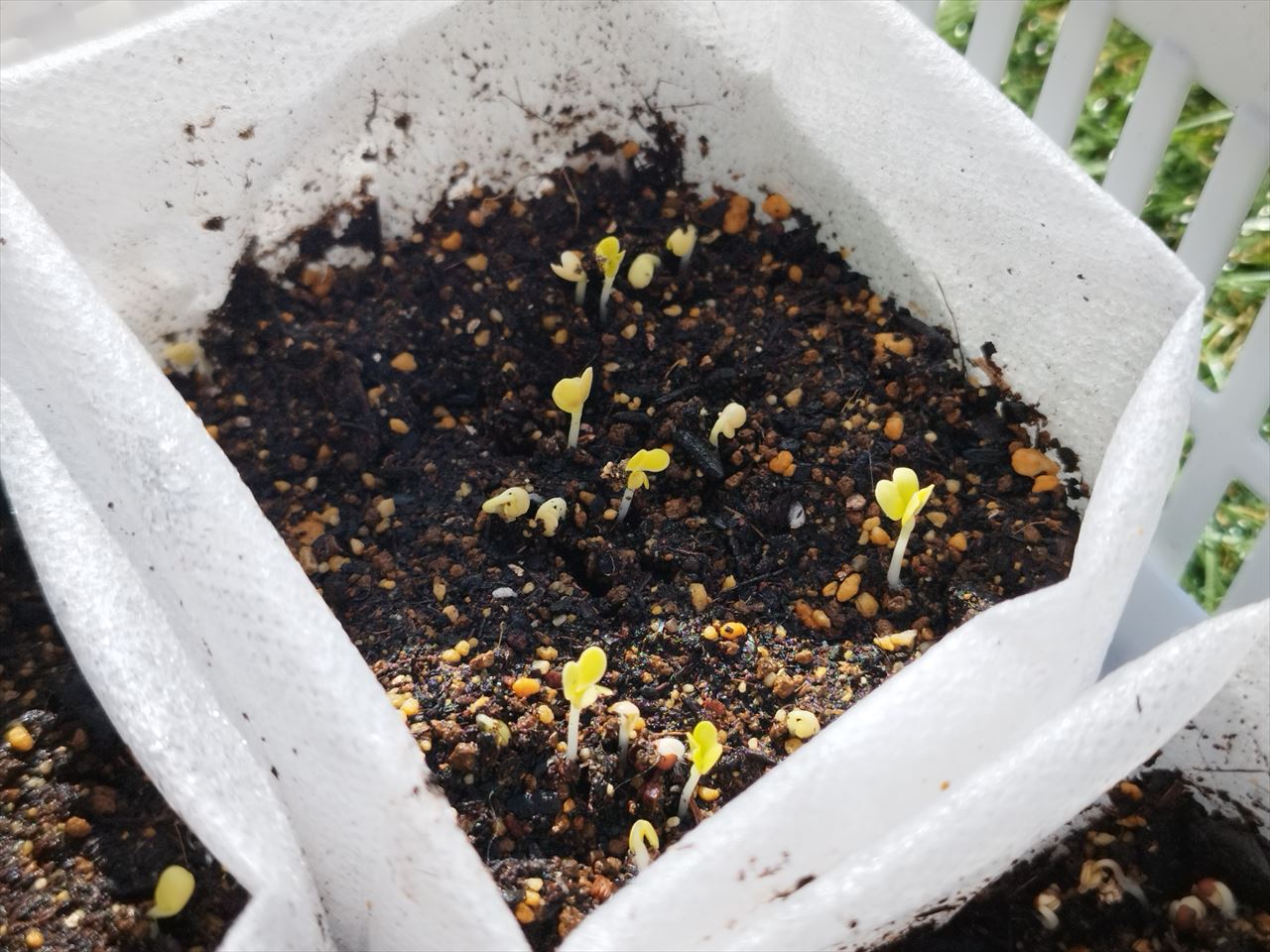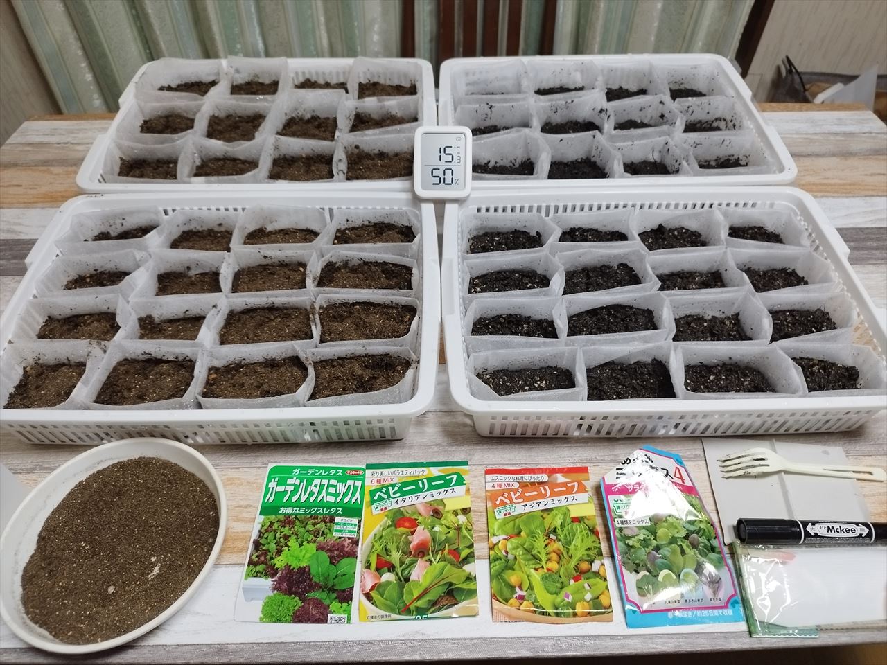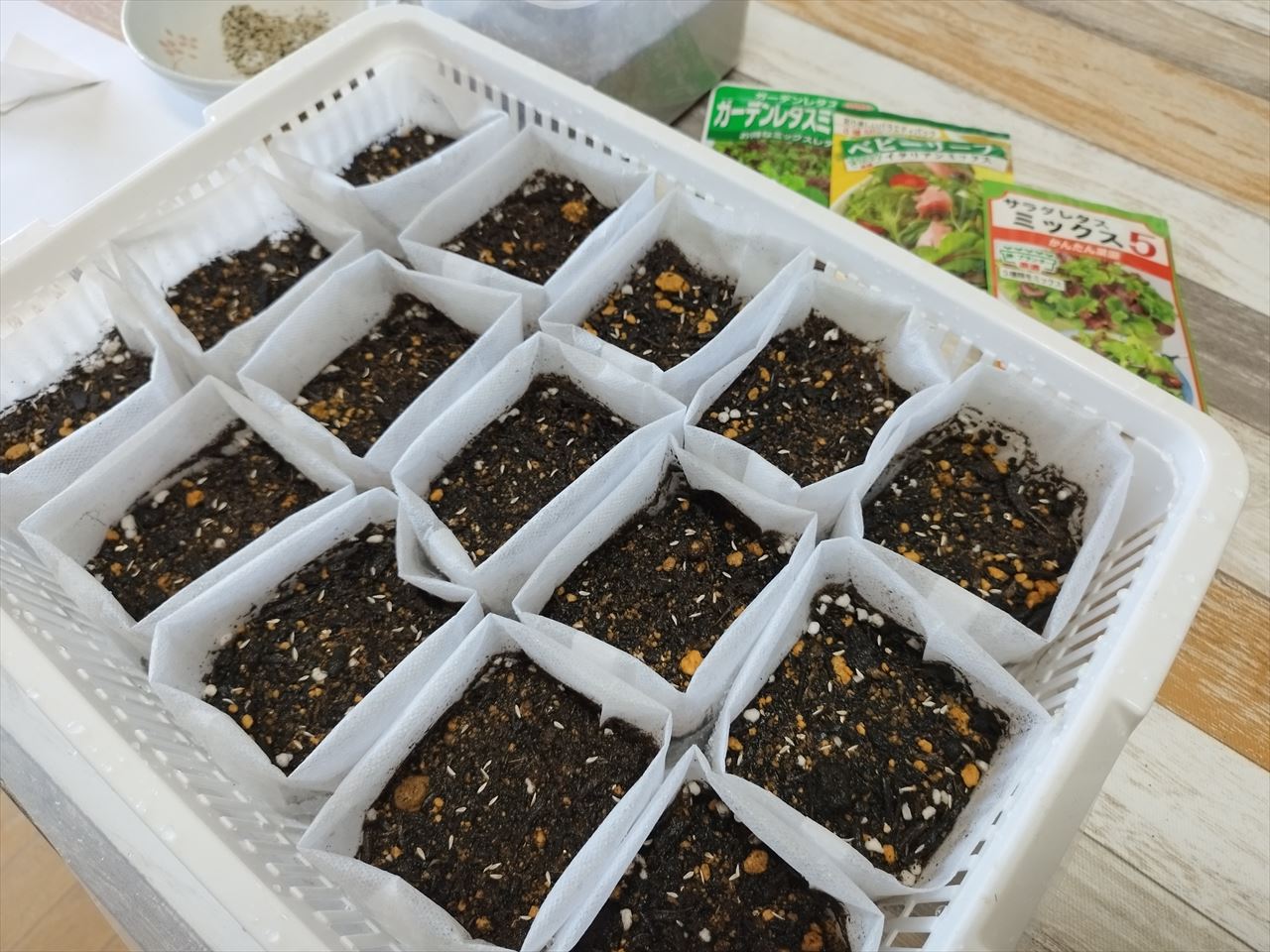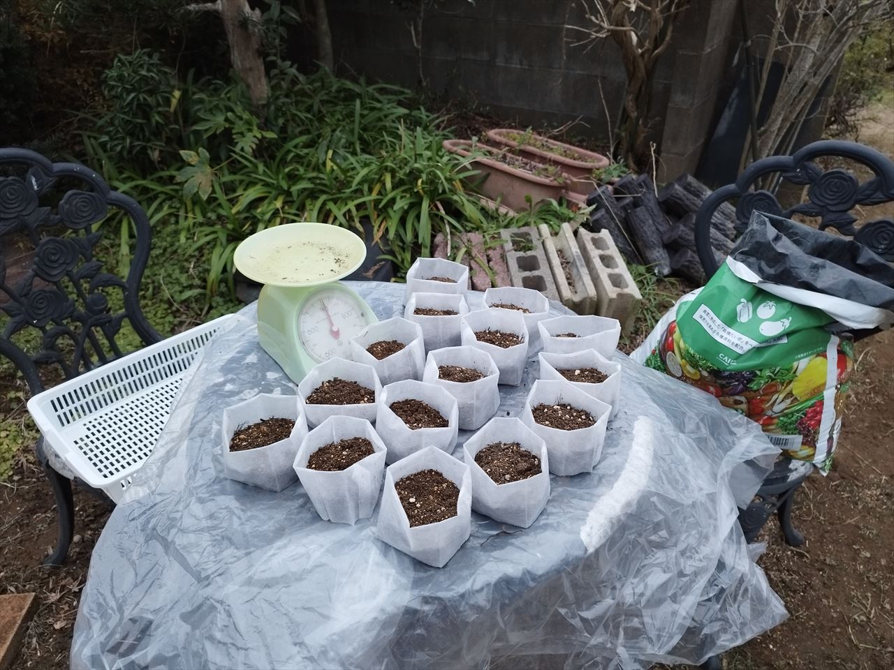 ホームセンターで野菜培養土を買ってきて不織布ポットに入れ、4種類のタネを蒔きました。