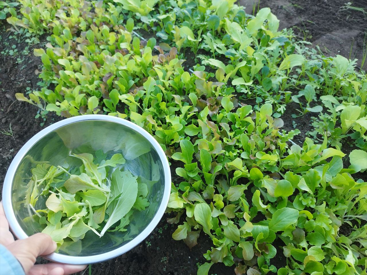 というのも、秋に畑で蒔いたベビーレタスやサラダ小松菜、水菜などが元気に育っているからだ。