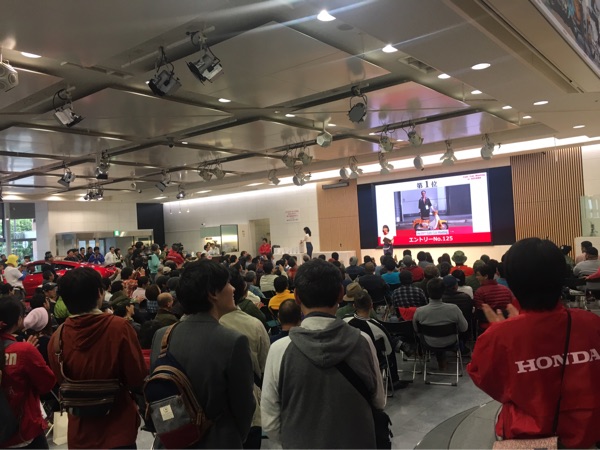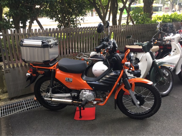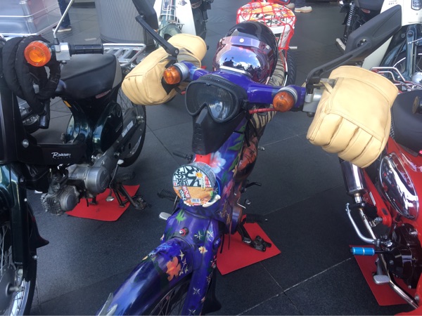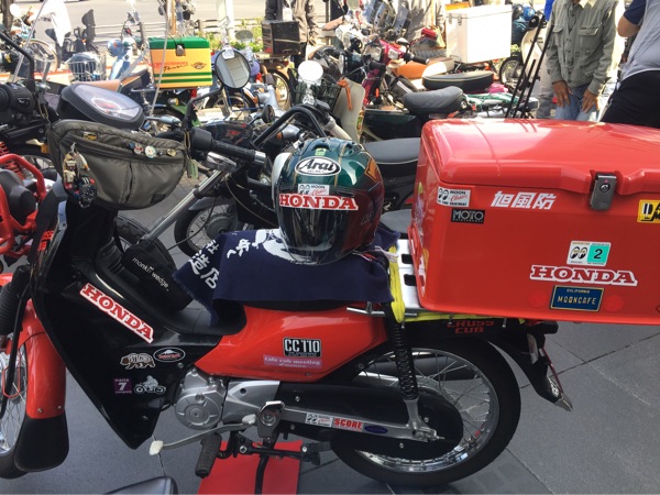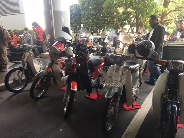 申込が遅くなってしまったので、受付け時間帯も遅くなり、自分の赤いクロスカブはちょっと裏手エリアの展示(?)に。でもまあ私のは、何もいじってない極めてプレーンなバイクなので問題なし。