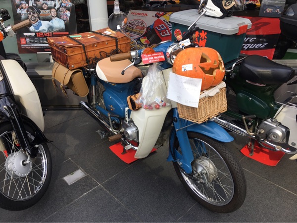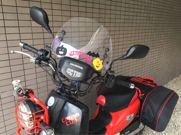 私の赤クロスカブは、風防に100円ショップで買ってきたハロウィンステッカーを貼りつけた程度なのだが、こちらは本格的なハロウィン仕様。ちょうど近くにオーナーさんがいたのでお話をすると、近くの農園でもらってきたかぼちゃを徹夜してくりぬいたんだとか。流石だ。