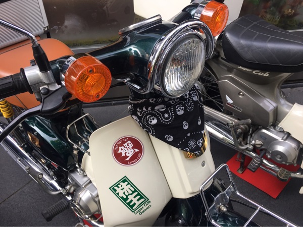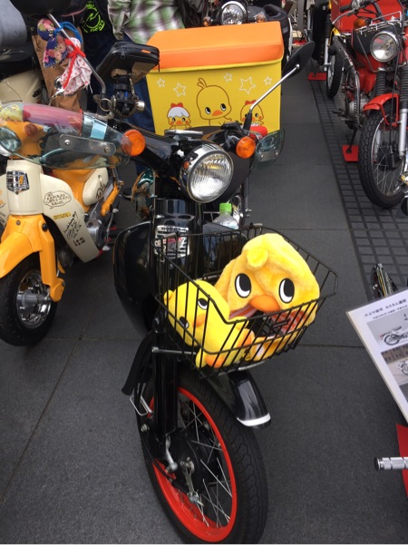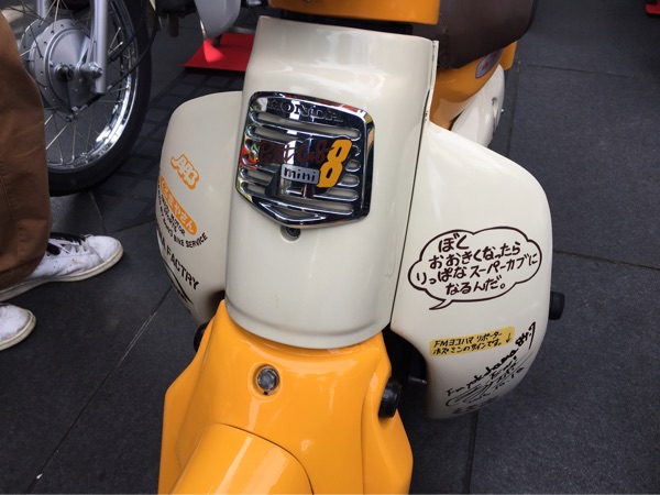 リアボックスは新調したそうでぴかぴか。前回チキンラーメンのスナックをいただいたのだが、今回もひよこ饅頭をもらってしまった。ここ以外で開催されているカブイベントにも精力的に顔をだしているようで、さらにはモンキーイベントにリトルカブで参加した話が面白かった。