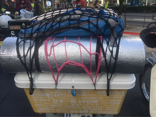 私と同じ赤いクロスカブのオーナーさんは、一年前にここで知り合い、いろいろお話させてもらい、その後もFacebook上で交流をさせてもらっている方なのだが、人より先にバイクを見つけてしまった。ステッカーも増えている。郵政カブが積んでいる巨大リアケースゆえ、年末になると待ちゆく人から年賀状託されそうになったりするらしい。今回もタイヤ交換のことなどいろいろアドバイスいただいた。