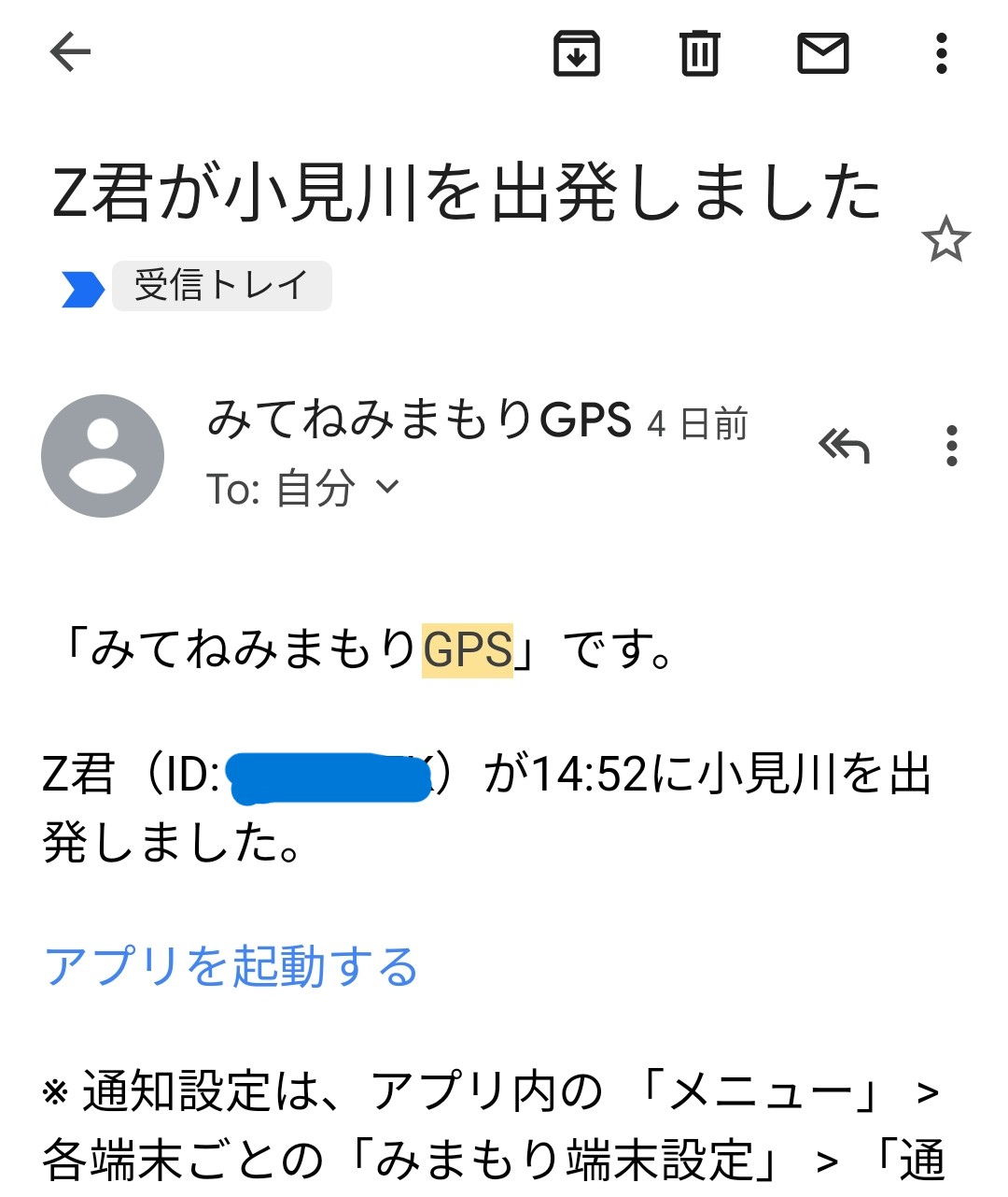 現在Z君は実家にいて、そこを自宅としてアプリに登録しているので、どこかにでかけた出発時と到着時にはアプリで通知がされ、こんなメールも届く設定にしている。