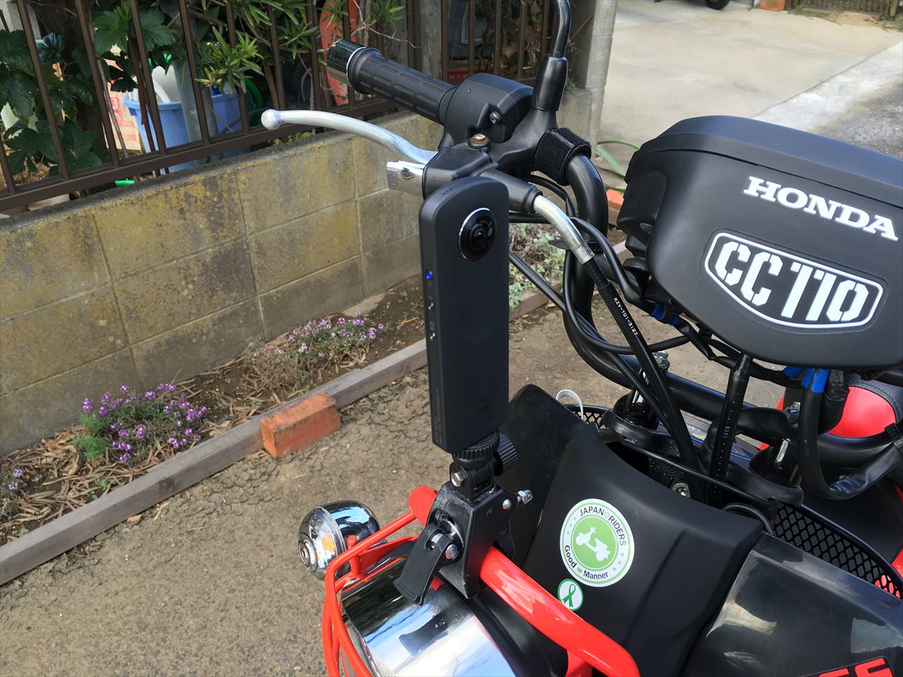 ただ、カメラレンズを左右向きにしたため、二つのカメラの接続部が自分とバイクの中心線に来てしまい、距離近い場所にごく一部歪みがでてしまった。バイクの「HONDA」という文字が「HODA」みたいになっている。