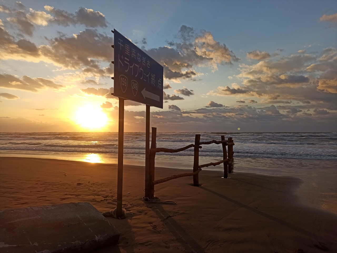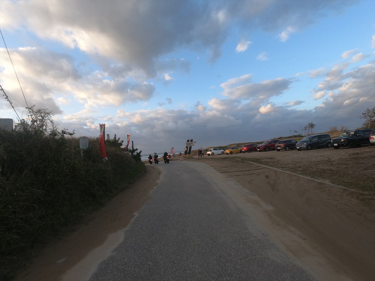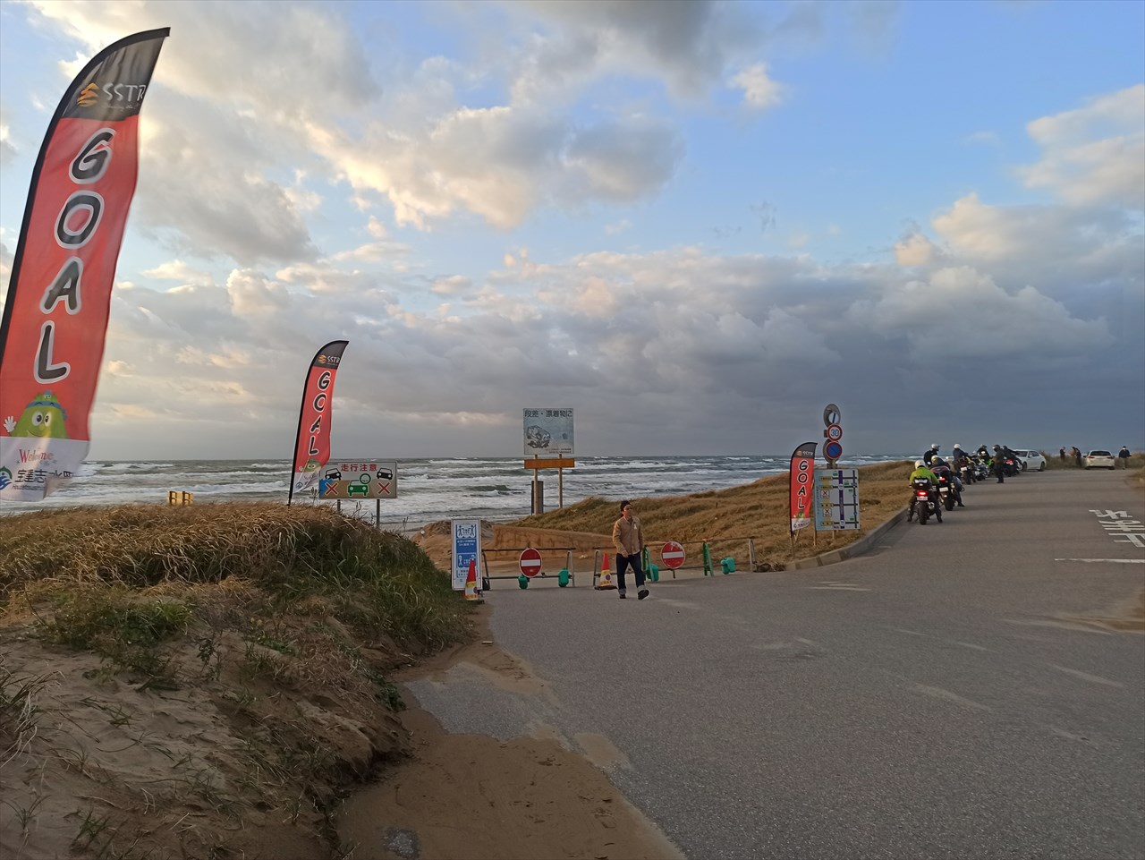 千里浜なぎさドライブウェイは、高潮の影響などもあり走行できる砂浜エリアがほとんどなく閉鎖されていた。砂浜を走ってのゴールができないのは残念だけど、一日最高の天気の中を走れた幸運を考えれば問題なし。