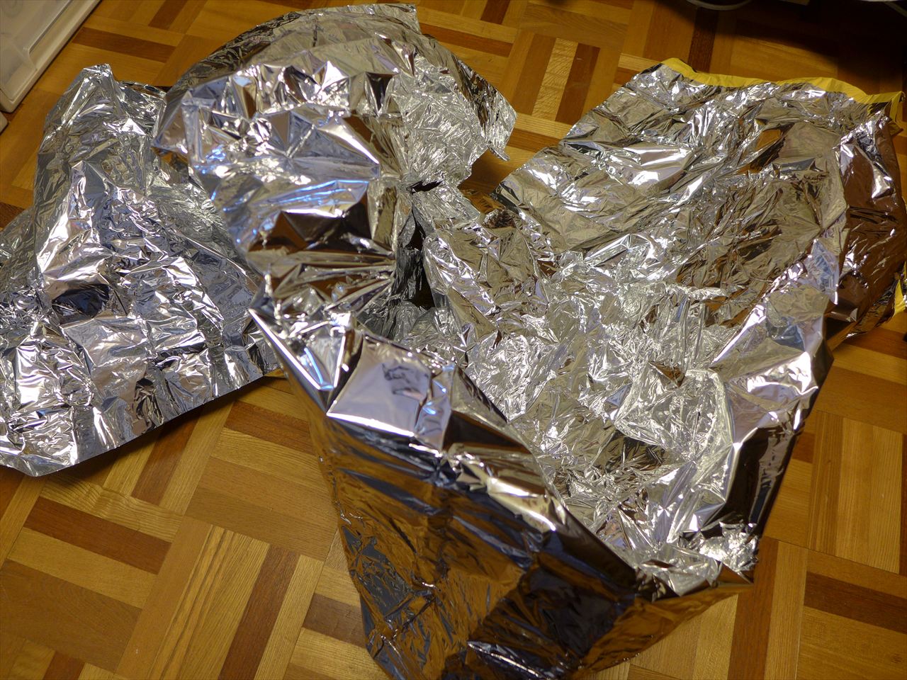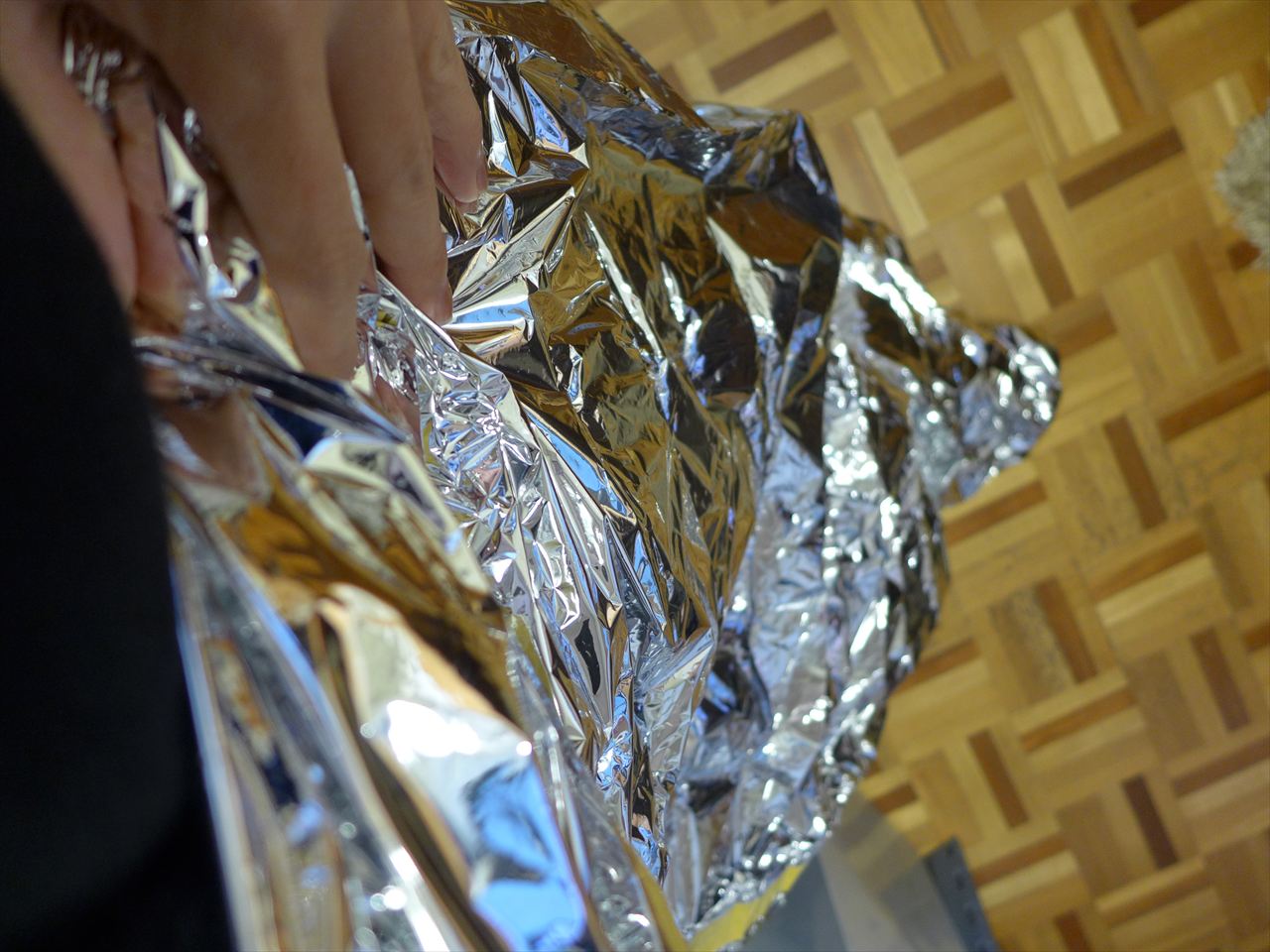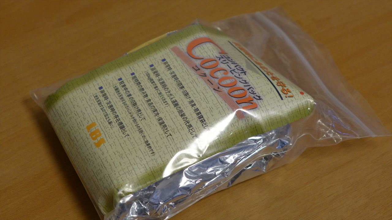 「いざという時に役立つかも」ということで、旅行の際にもカバンの隅っこに突っ込んで持っていくことがある防寒&保温サバイバルシート。家の中はもちろん、車の中や会社などに転がしておくことをおススメする。