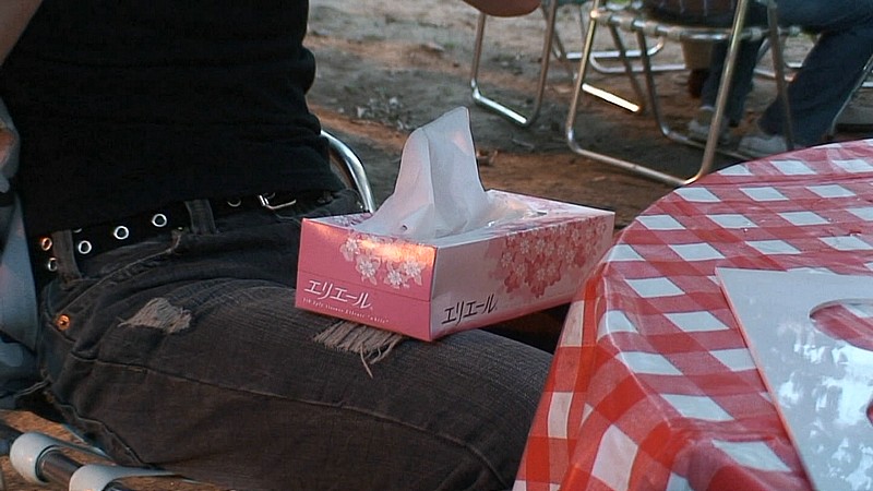 なぜか迷彩柄のバッグから箱ティッシュをとりだす男性メンバー。