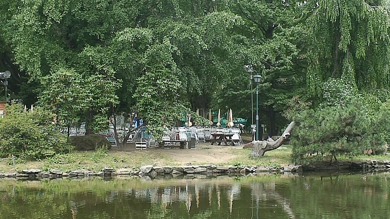 ビアガーデン会場は、赤レンガ庁舎の目の前の、池に隣接した公園の一角。