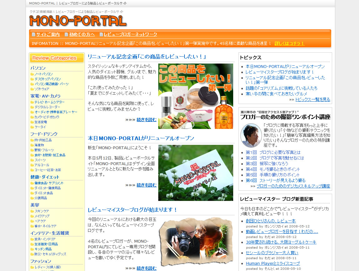 MONO-PORTALでは、5月12日から6月11日まで、リニューアル記念企画「この商品をレビューしたい!第一弾」を実施しています。