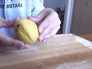で、両側をしっかり手でもって、二つに割る。割る。・・・割れないぞ。ひねるのかな?うーん、よく熟しているからひねろうとすると、つぶれちゃいそうだ。