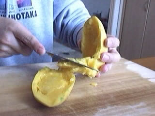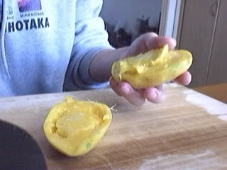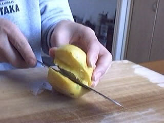 しかし・・・種が取り出せない。しかたながないのでここも包丁を入れよう。なんか、だんだん自信なくなってきた。お母さんの言うとおりかも。苦戦。あ、今「ほぉらね。やっぱり難しかったでしょ」って言ったでしょ?