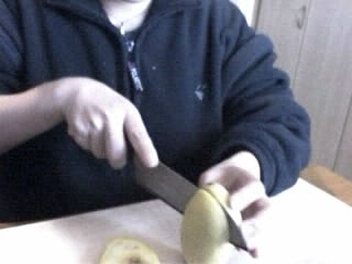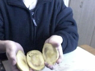 前回は失敗だった。周囲にぐるりと包丁をいれ、手でひねって両端をわけようと思ったのだが、種と実の癒着が激しい。結局、包丁で種をえぐろうとしたら、見事に崩れてしまったのだ。