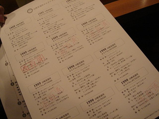 色・味わい・香りなどが書かれている。もちろんテイスティングで最終的にどれにするか選ぶのだとか。価格は150万円以上のものが多かったようだが、「売約済」の判子がかなり押されている。