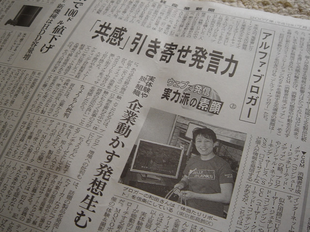 日経産業新聞 おとといの話なんですが、7月10日付日経産業新聞で、「体当たりリポート」を書くブロガーとして記事内で紹介してもらいました。 「α」の実力はないので、そこを誰かに突っ込まれそうで正直ちょっと赤面モノなんですが、実体験重視というところや、MONO-PORTALのコンセプトについてまで触れてもらえ、嬉しかったです。 ちなみに写真は、ビリーTシャツ着てビリーバンド持っている自分です。 前の記事 次の記事 コメント Ryu 2007年7月13日 23:11 お〜凄いですね♪ 日経に載るってのはやっぱりαだと思いますよ〜。 wadaさんは影響力あると思いますもん。 返信 さわー 2007年7月14日 12:00 これからも「体当たりリポート」を楽しみにしてますよ! 返信 ゴールデンキャット 2007年7月14日 12:50 私の職場では、日経産業新聞を購読していて、仕事に有益な記事を「注目記事」として、ピックアップ、部署全員で回覧しています。 和田さんの記事も「注目記事」として、全員で参考にさせていただきました。 これからも、レビューブログ、楽しみにしています! 返信 わだ 2007年7月14日 17:37 Ryuさん、 いい影響だといいのですが(笑 さわーさん、 壊れない程度に体当たりしてみます♪ ゴールデンキャットさん、 ああ、ありがとうございます。というかお恥ずかしい限りです、写真付で・・・。 返信 nikitoki 2007年7月18日 22:27 レビュー記事はいつも参考になります。弊ブログでは、ちょっと失礼な書き方をしまして申し訳ありません。 その後、ご本やブログを拝見して、どんどん前に読み進められる独自の魅力を持った文章だと発見しました。 誰にでも書けそうで、実は誰にでも書けないんですよね。簡単に見えるものほど、実は難しい。 拙エントリーへのコメント、ありがとうございます。 返信 わだ 2007年7月18日 23:37 nikitokiさん、 失礼だなんてとんでもないです。 正直久しぶりに、「トラックバックでこうした他の方の意見を読んで考えることができるブログの仕組みって本当にすごいなあ」と実感しました。真面目に何回も読ませてもらいました。 コメントでも書きましたが、nikitokiさんが後半で書かれていたことに深く共感しました。 個人ブログが、その実態以上にもてはやされている側面も多々あると思います。自分自身も、絶対に「勘違い&自意識過剰ブロガー」になってしまったりしないよう、気をつけないといけないなと思いました。 今後ともよろしくお願いいたします。 返信 コメントする コメントする 返信する コメント 名前 電子メール URL サインイン情報を記憶
