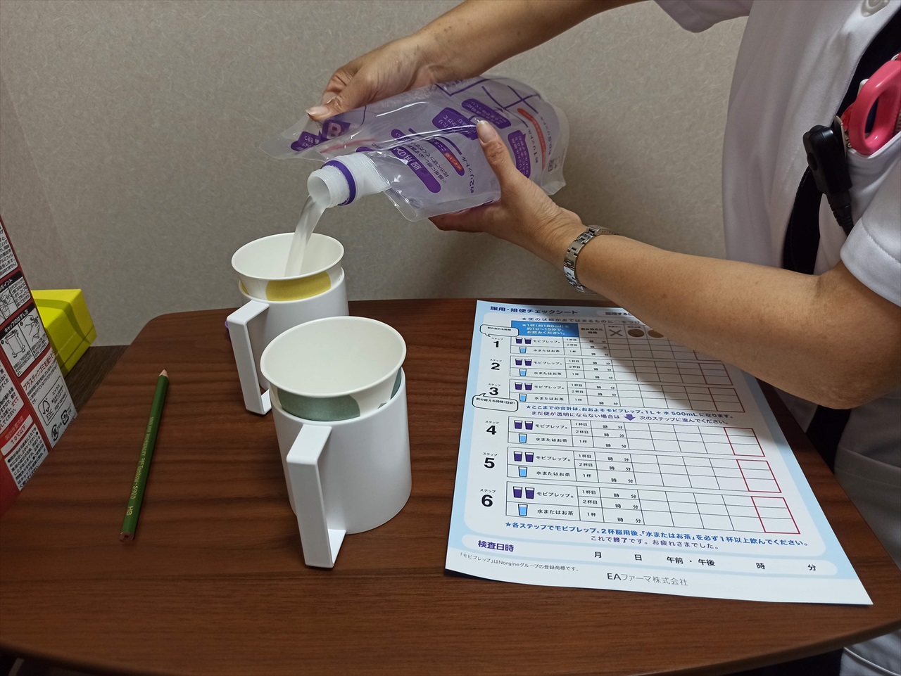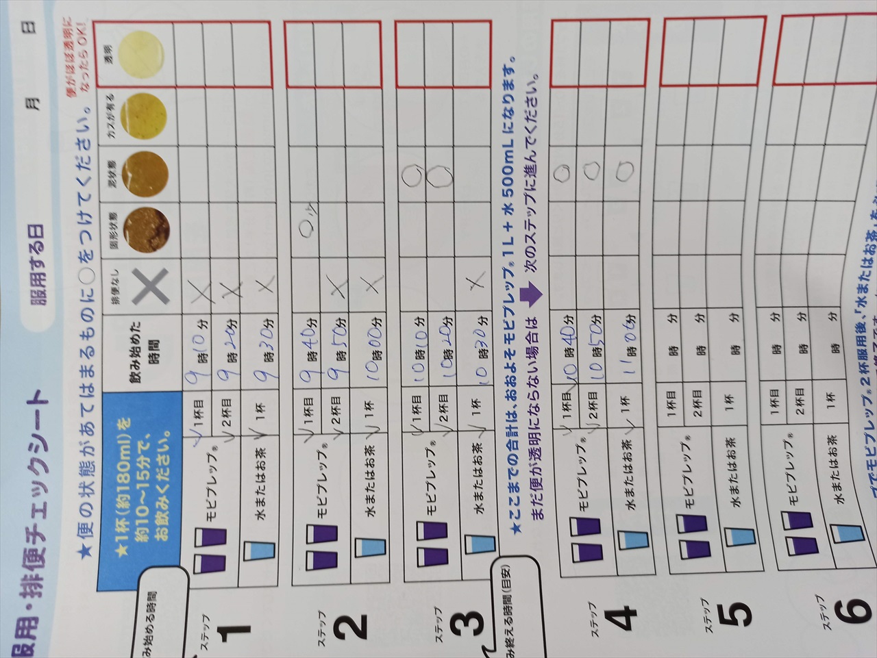 モビプレップは胃からも腸からも一切吸収されず、大腸の内壁に残った便をきれいに洗い流してくれるもの。排便する度、便がどの程度混じっているかをチェックして表に付け、最後透明な液体だけが出てくるようになったら洗浄完了なのだという。