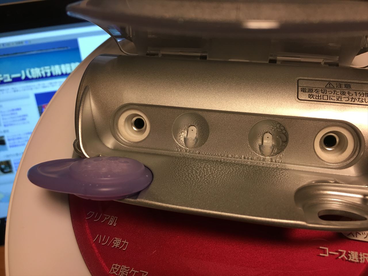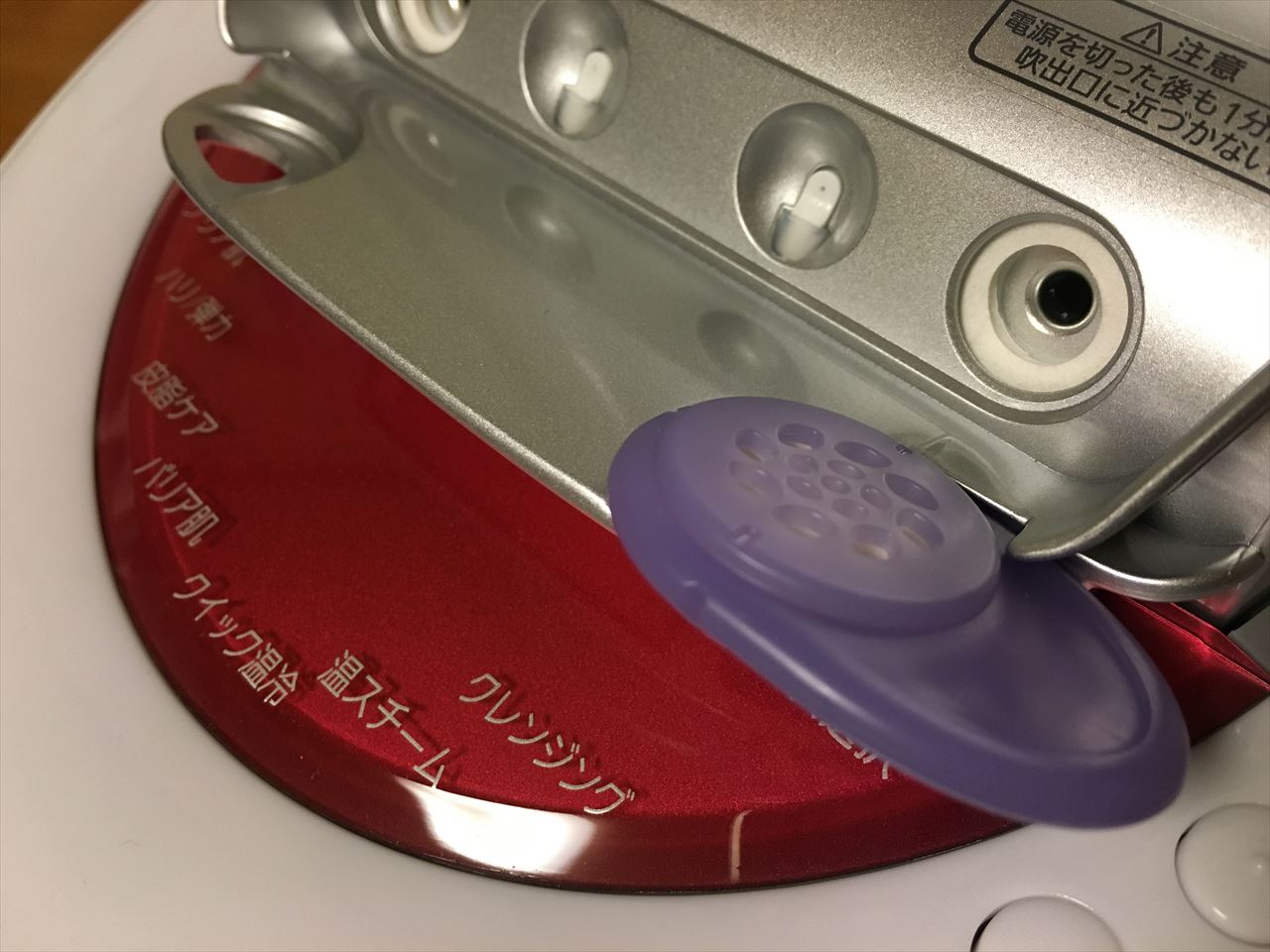 中央よりの2つの穴が冷ミスト吹き出し口、両脇が温スチーム吹き出し口。