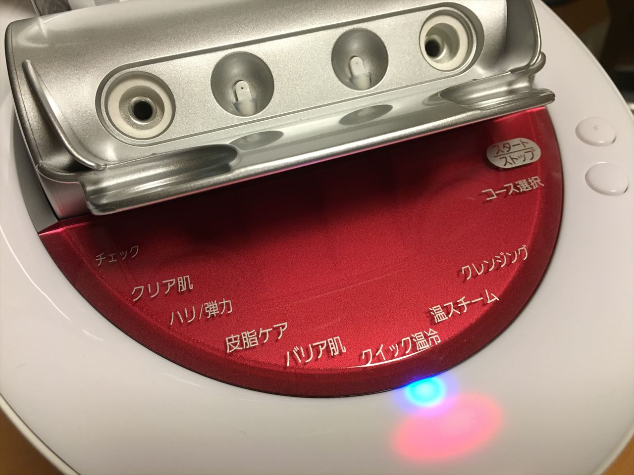 コースを選択するとこんな風に青いランプでどのコースを選んだかがわかるようになる。スタートボタンを押すと温スチーム時には赤いランプが、冷ミスト時には青いランプが点灯する。