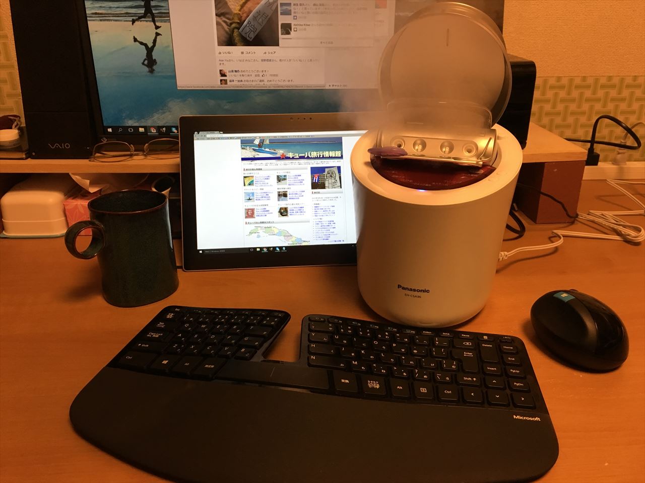 スチーマーをパソコンとキーボードの間に置き、顔はスチーマーに向けつつ、目だけディスプレイを見て作業している。