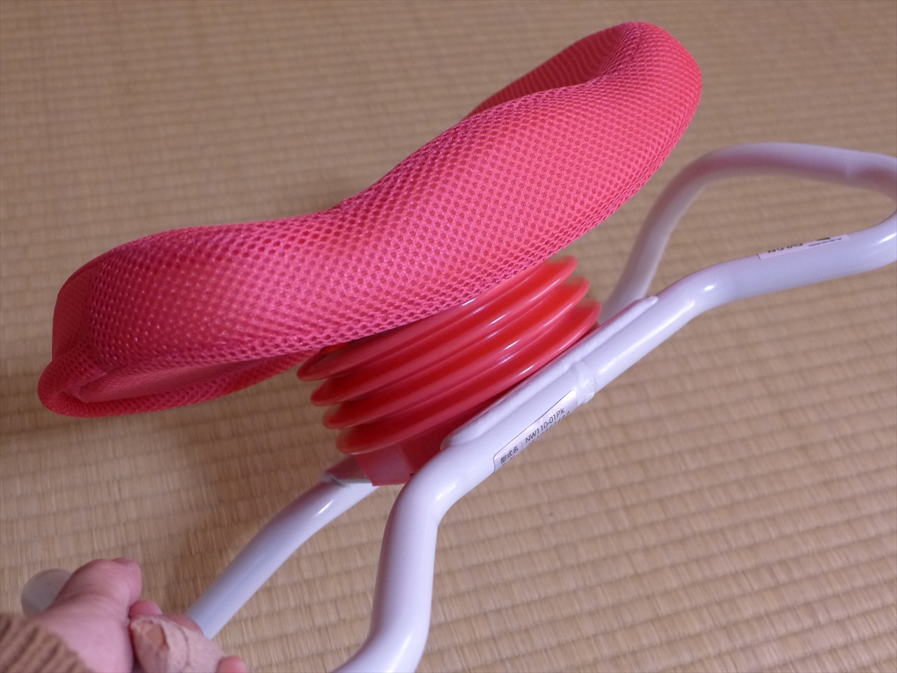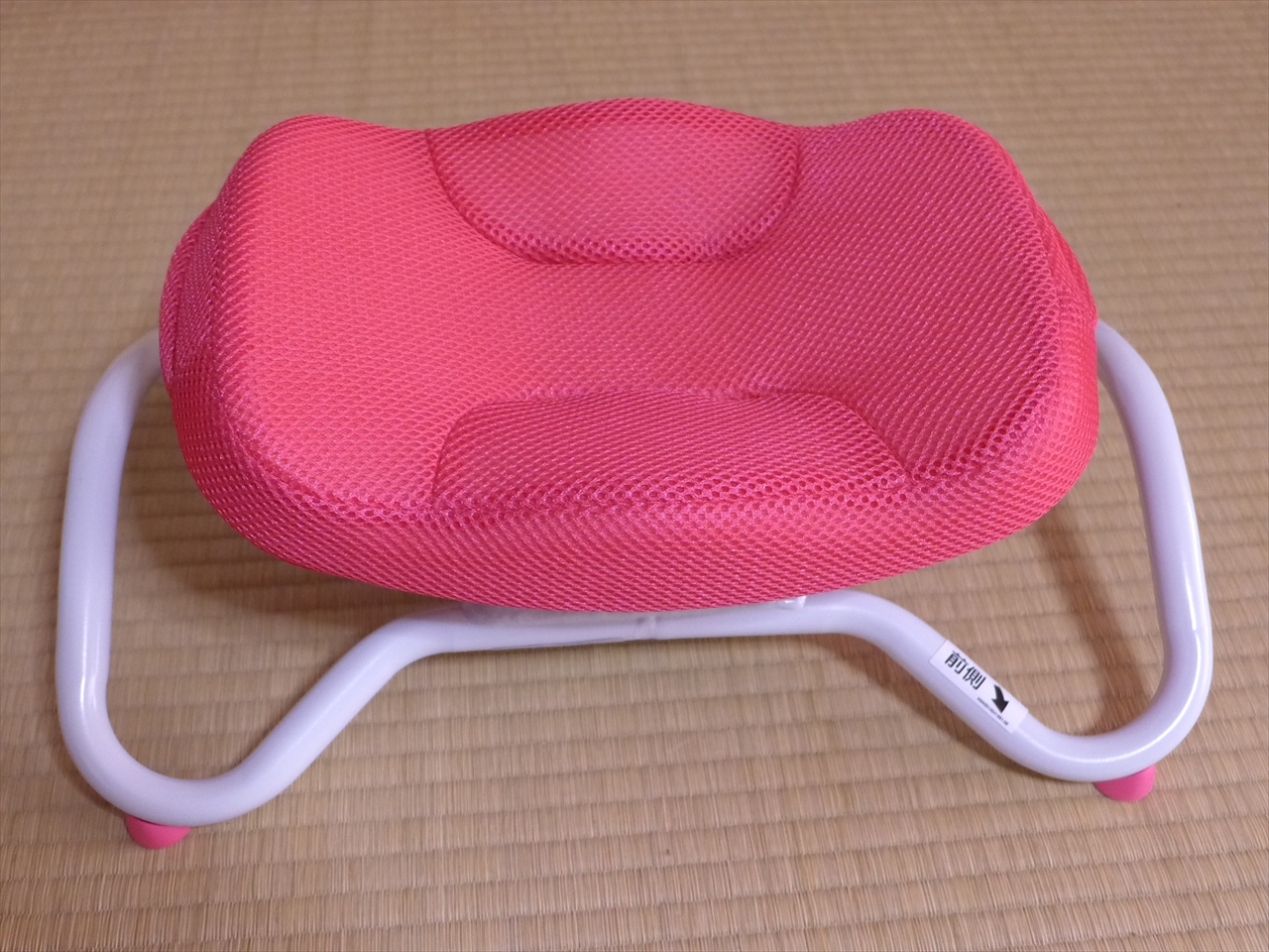 白いパイプ台座の上にピンク色の座面。座面はヒップの形にくぼんでいてエクササイズ時にずれないすり鉢状になっている。ビジネスチェア的な硬さ。