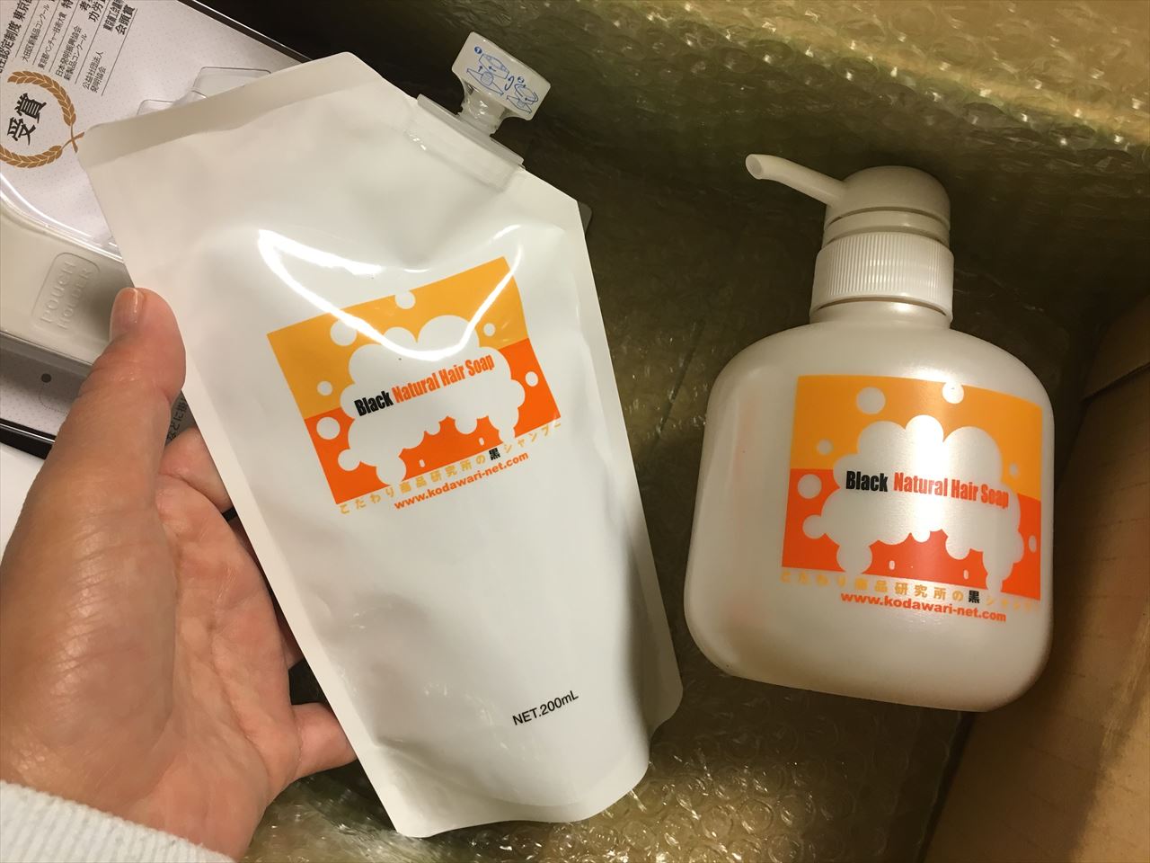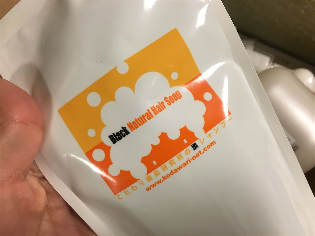 まあ人生の折り返し地点もとーの昔に越えているので仕方ない現象なのだが、40代のうちだけは少しあがいてみようかなと思い、以前サンプルを使った時に非常によかった、こだわり商品研究所の「ブラックナチュラルヘアソープを購入してみた。