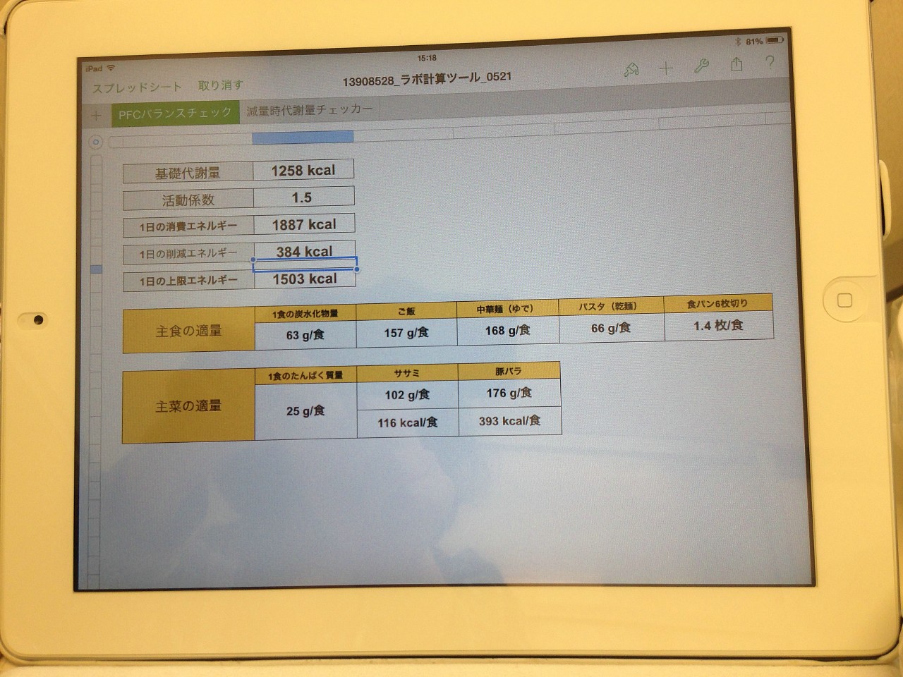 私は身体を動かす仕事ではなく、ほぼ一日パソコンの前に座っての作業となるので、その場合の活動係数は「1.5」。基礎代謝に1.5をかけると、実際に一日でこのくらいのエネルギーが消費されているだろうという数値がでる。