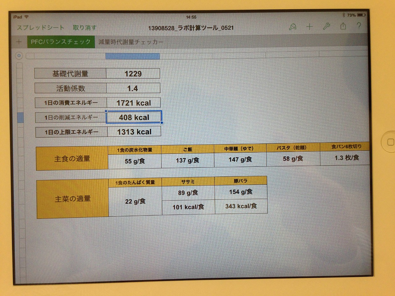 もう一度現在の数値と、目標体重などから、新しい一日あたり削減エネルギー目標を割り出す。残り1.7kgなので前よりは少し大きくなり、408kcal。