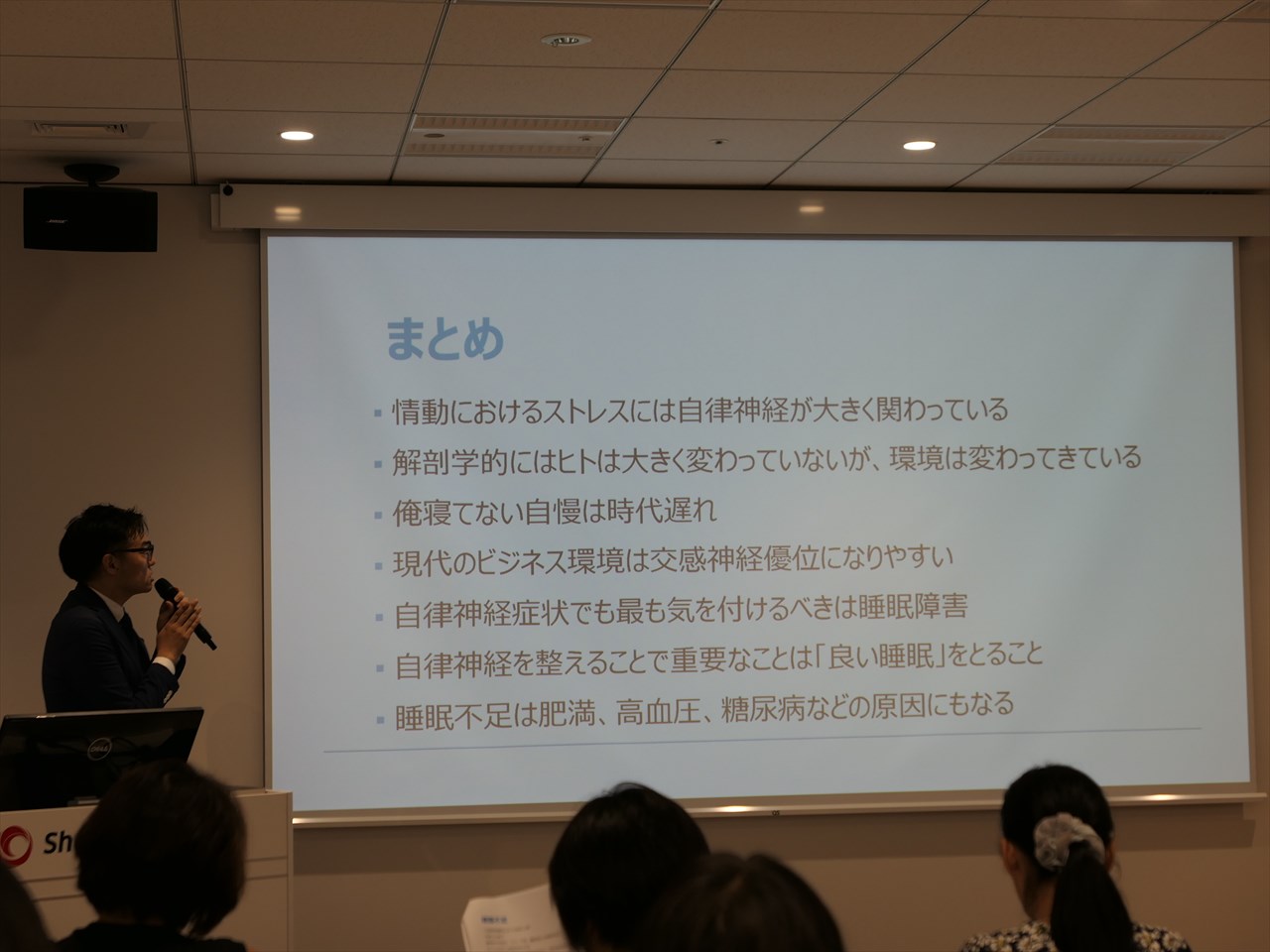 産業医の大室氏はストレスと常に隣り合わせで交感神経優位になりやすい現代のビジネス環境。自律神経を整えるために重要な「良い睡眠」がいかに大事かという話を非常にわかりやすくしてくれた。