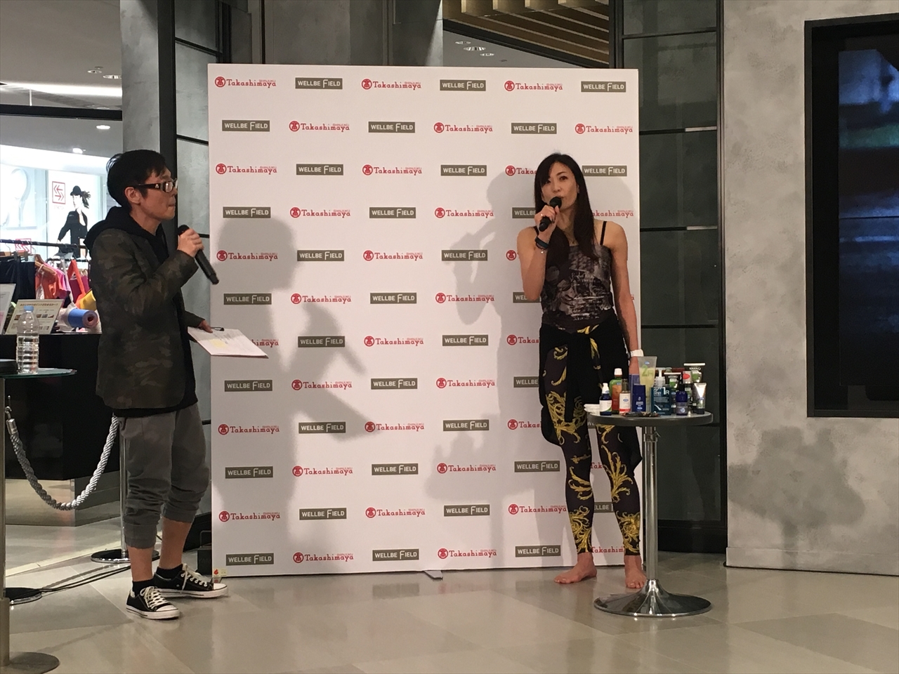 この日は空中ヨガの第一人者である元シェイプアップガールズの中島史恵氏が来場し、無料体験レッスンが開催されていた。