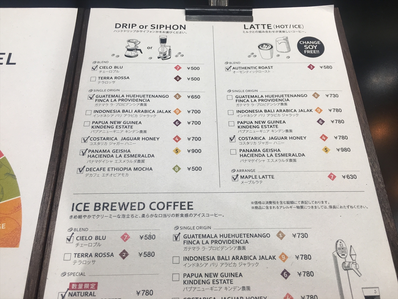 そして次の課題は豆を何にするか。ブレンドも2種類あり、豆種類が選べる「SINGLE ORIGIN」も全部で6種類。そのうちチェックがついているのがその時飲めるもののようだ。