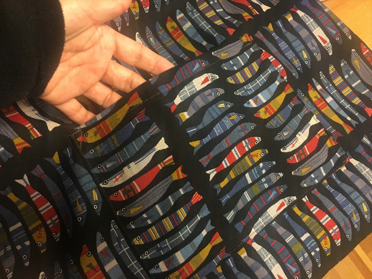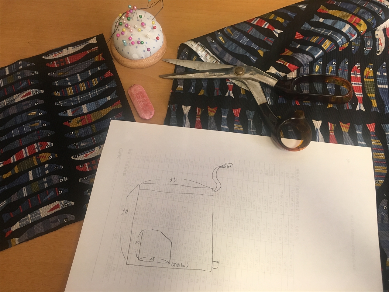 魚を縦横に配置してアクセントにしたかったのと、薄手のフェイスタオル一枚入れておけるサイズにしたいと思ったためだ。