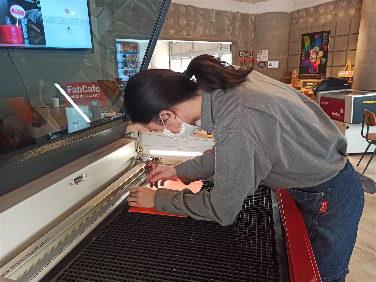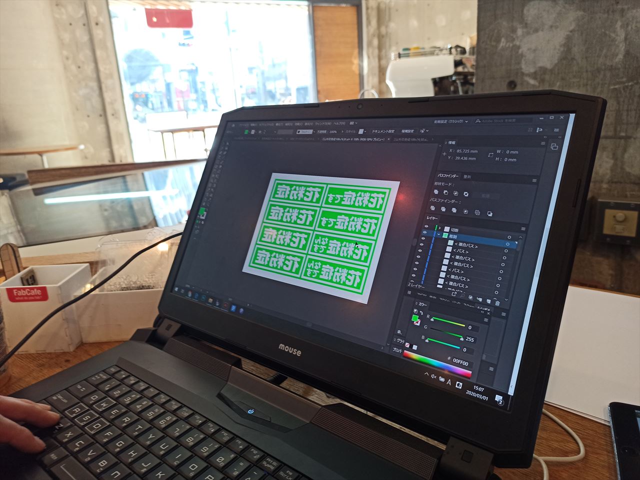 一週間後の3月1日、レーザーカッター利用45分枠をオンライン予約し、いよいよゴム判作りに挑戦だ! Fabcafeが初心者にとって非常にありがたいのは、イラストレーターの原稿さえ作って持参すれば、機械の設定や実際の加工などはすべてスタッフがやってくれること。