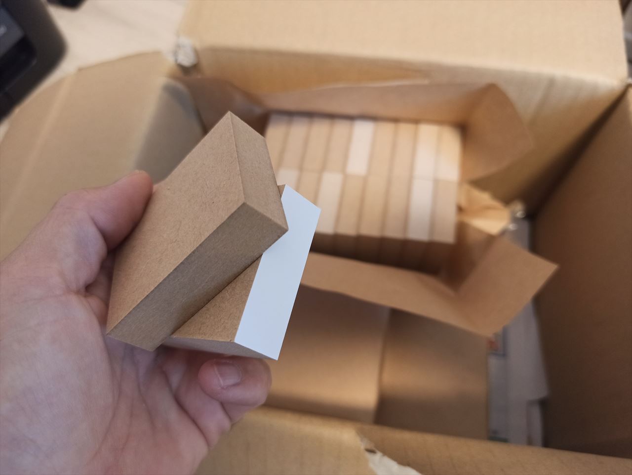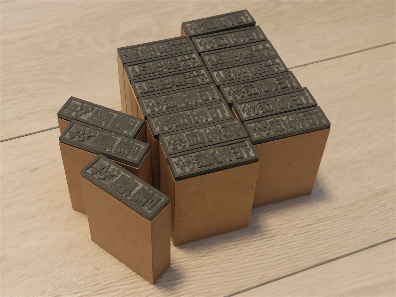ゴム判の取っ手部分「台木」は、「印材館」という印材専門オンラインショップで購入している。最初試作品段階では適当なサイズのものを購入したが、二回目のオーダーからはゴム判の4.5×1.5㎝に合わせオーダーメイドしている。