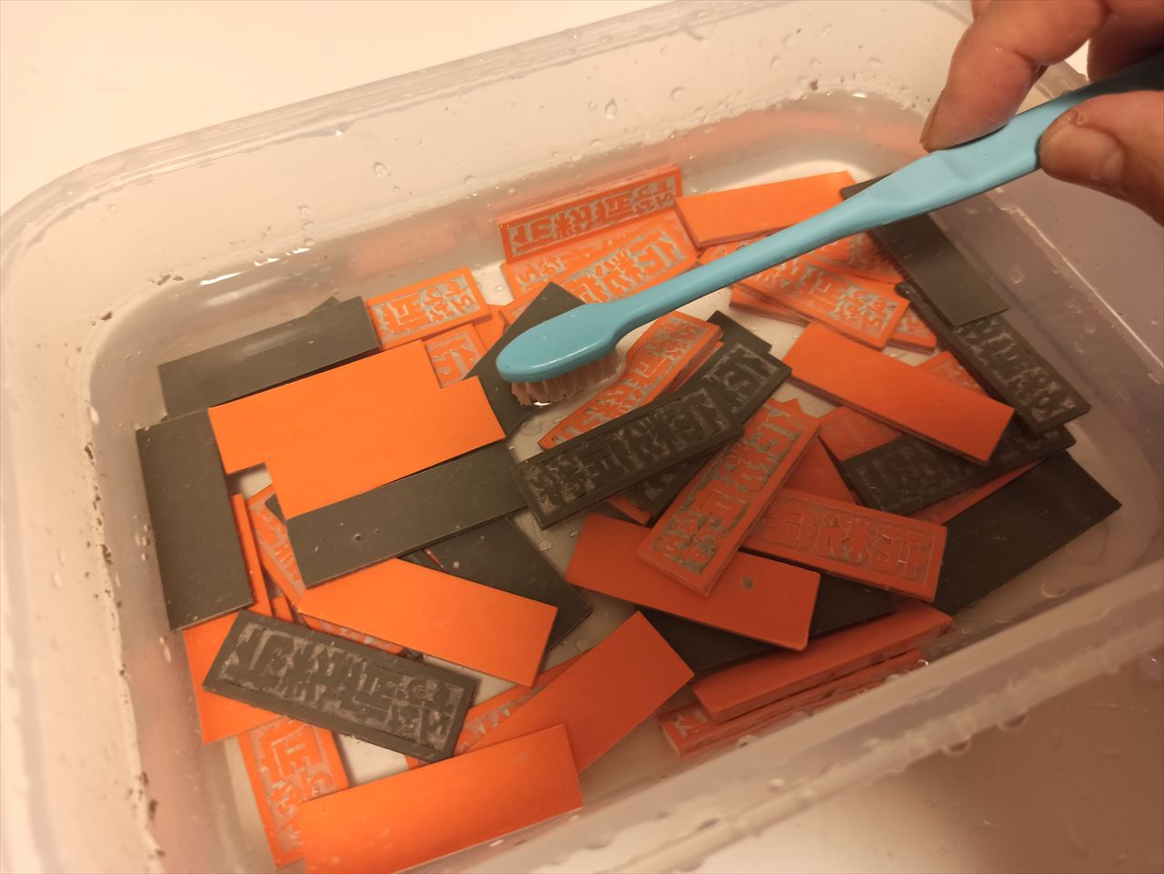 凹凸のスキマに細かな灰がつまっているので、歯ブラシを使って一個ずつ丁寧に水洗いする。