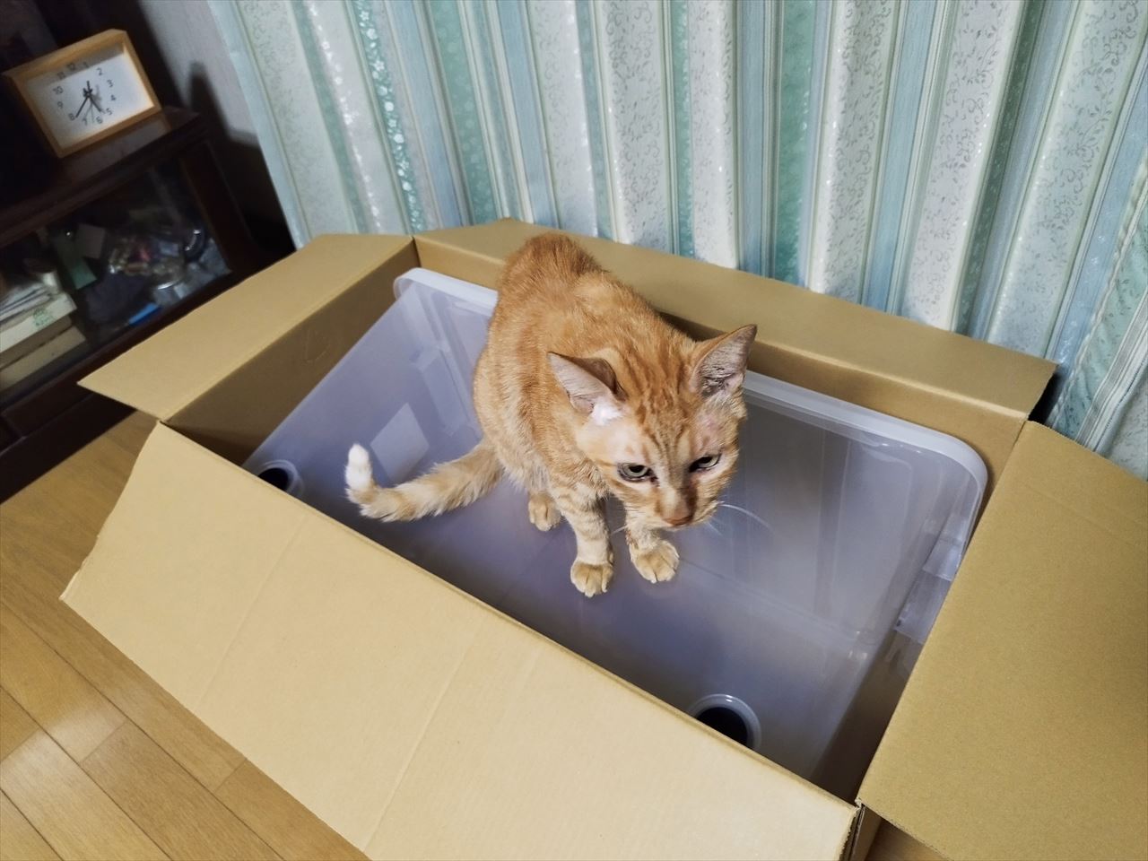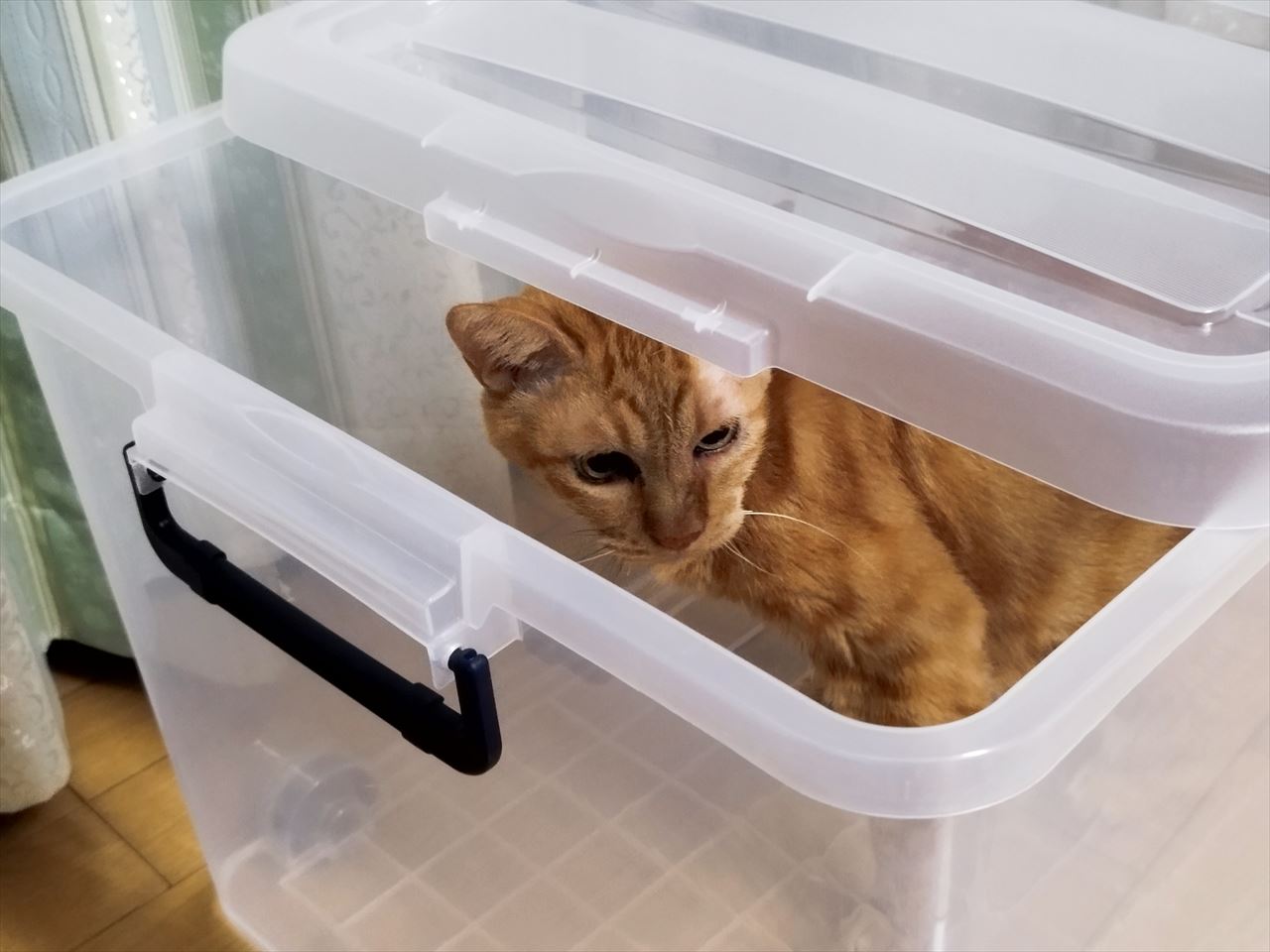 今までフタがない状態の衣装ケースを使っていたので、これだと頭がつかえて嫌かなと思ったけど、特にそんな様子もなく、むしろちょっとうれしそうだ。このくらいの高さだと、入る時も出る時もごく軽いジャンプをする程度だ。