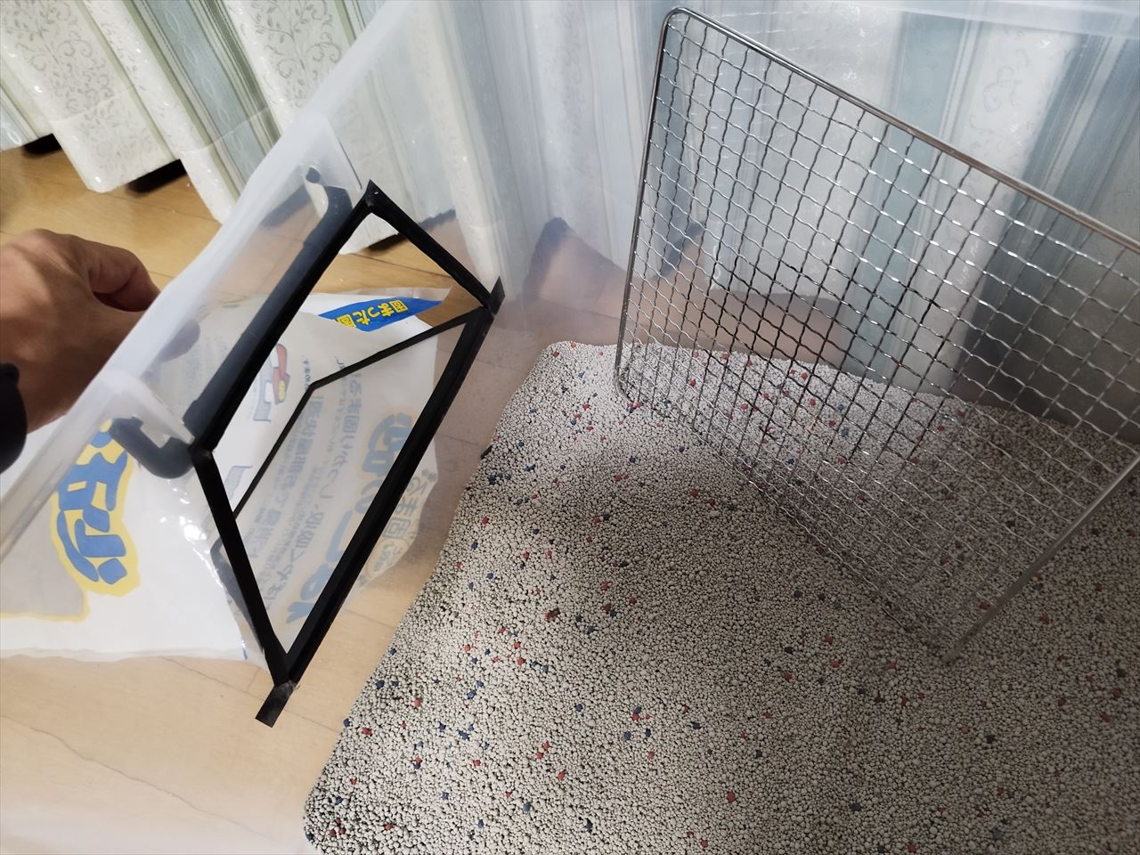 排泄物の掘り起こしは、BBQ用の30cm網を使っている。これを端から端まで通せば、中に埋もれているフンもおしっこの塊も全部まとめてすくいあげ、すみっこにまとめることができるからだ。