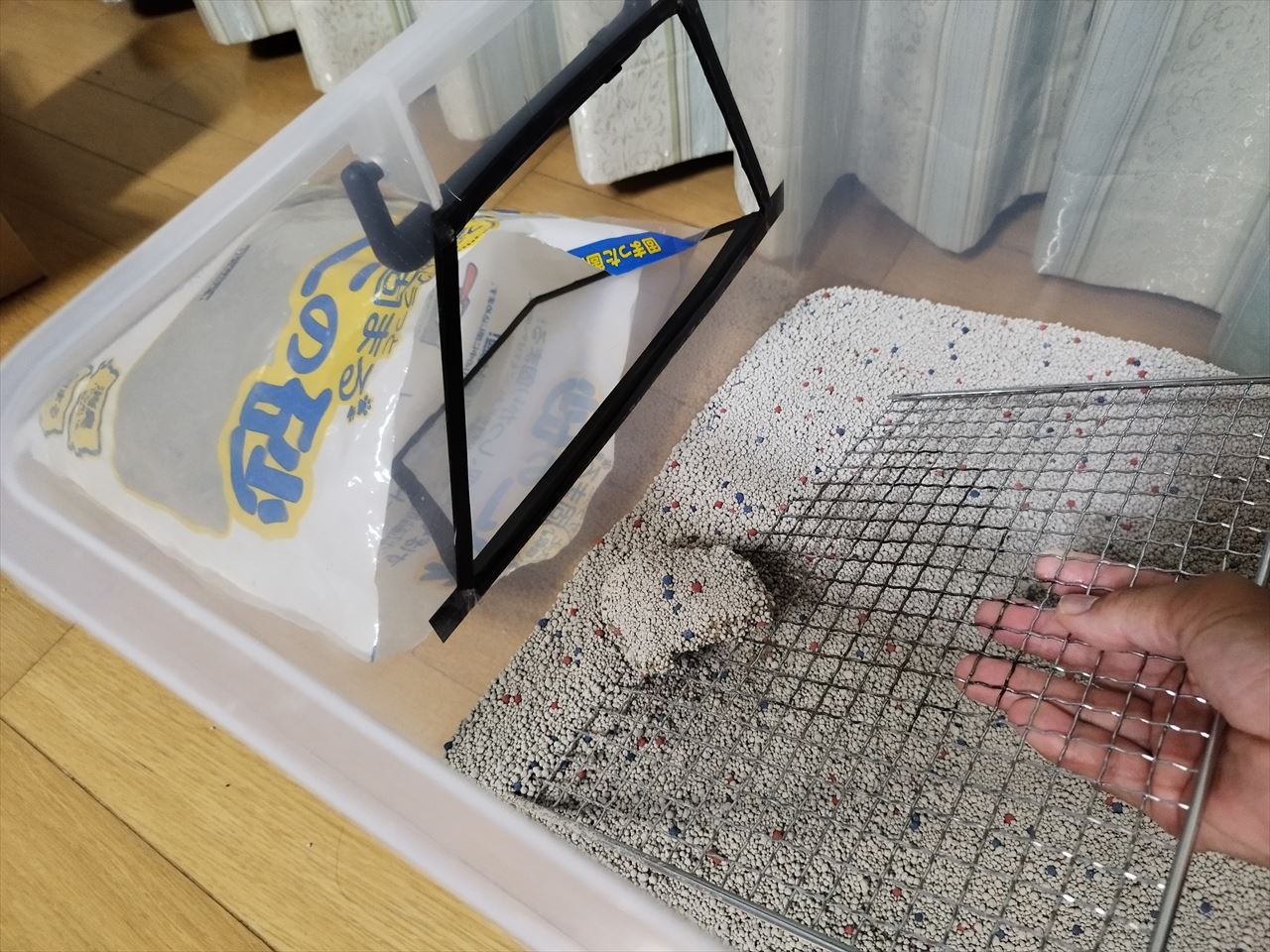 今までは、その状態で底がざる状態になったスコップで、排泄物だけをよりわけ、袋に入れて捨てていた。