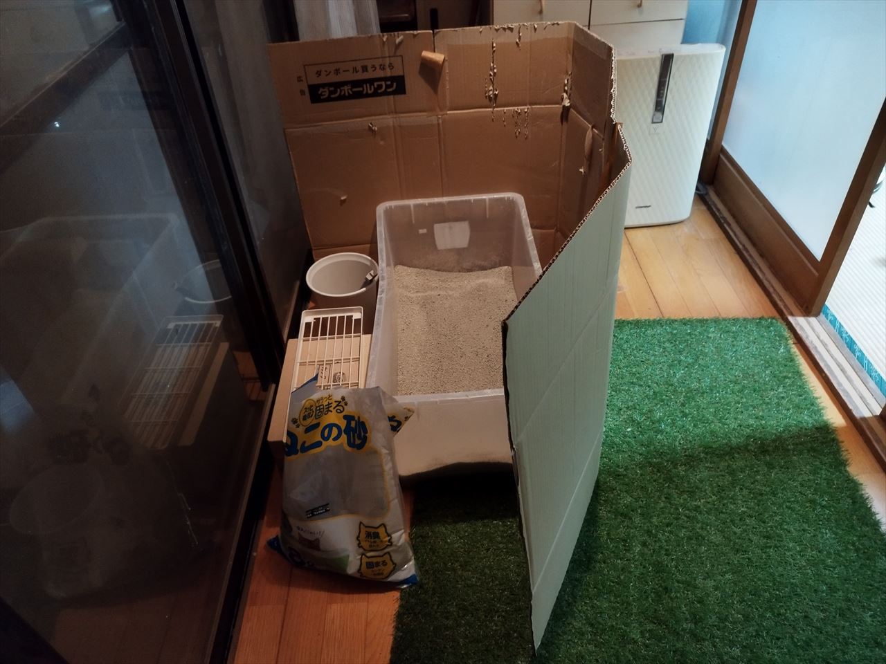 ふたがなくて、用を足した後の砂かけで一面に砂がちらばってしまうため、段ボールで囲っている。
