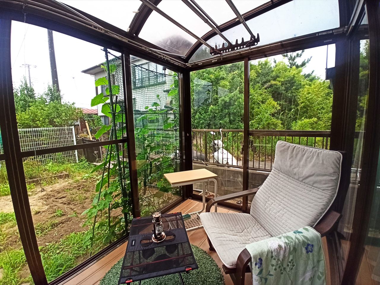 昨日のブログ記事「きゅうりカービングに挑戦」で、サンルームの目隠しのためきゅうりとゴーヤの苗を植えたと書いたが、それが育つ前のサンルームはどうだったかというと、こんな感じ。