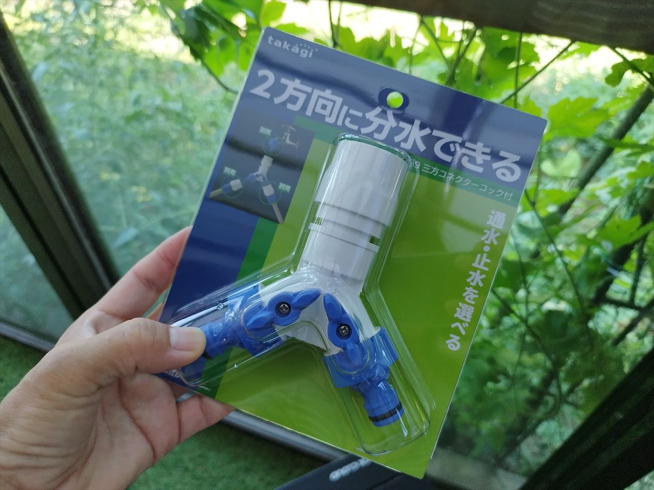 コネクタは買わないとだめかなと思ったら、元々ホースの先につけていたジョイントパーツにかちゃっとはめ込むだけでいけた。タカギ製品ではなかったんだけど、規格が決まっているようだ。