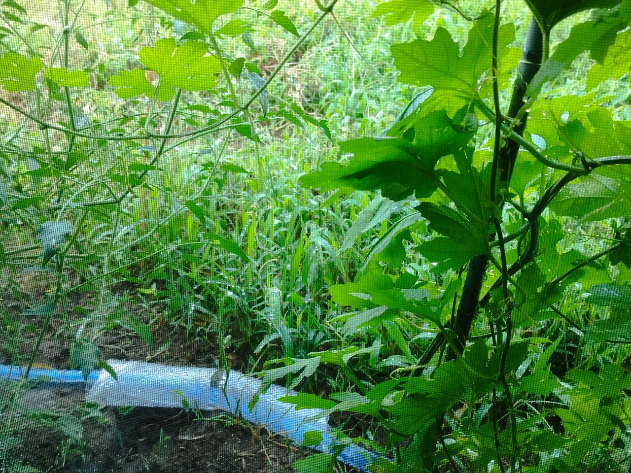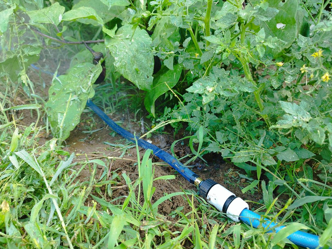 ただこんなに広範囲に散水する必要なないので、チューブの向きを斜めにして小さな野菜畑とひまわりを植えたところに水が集中的にいくようにした。