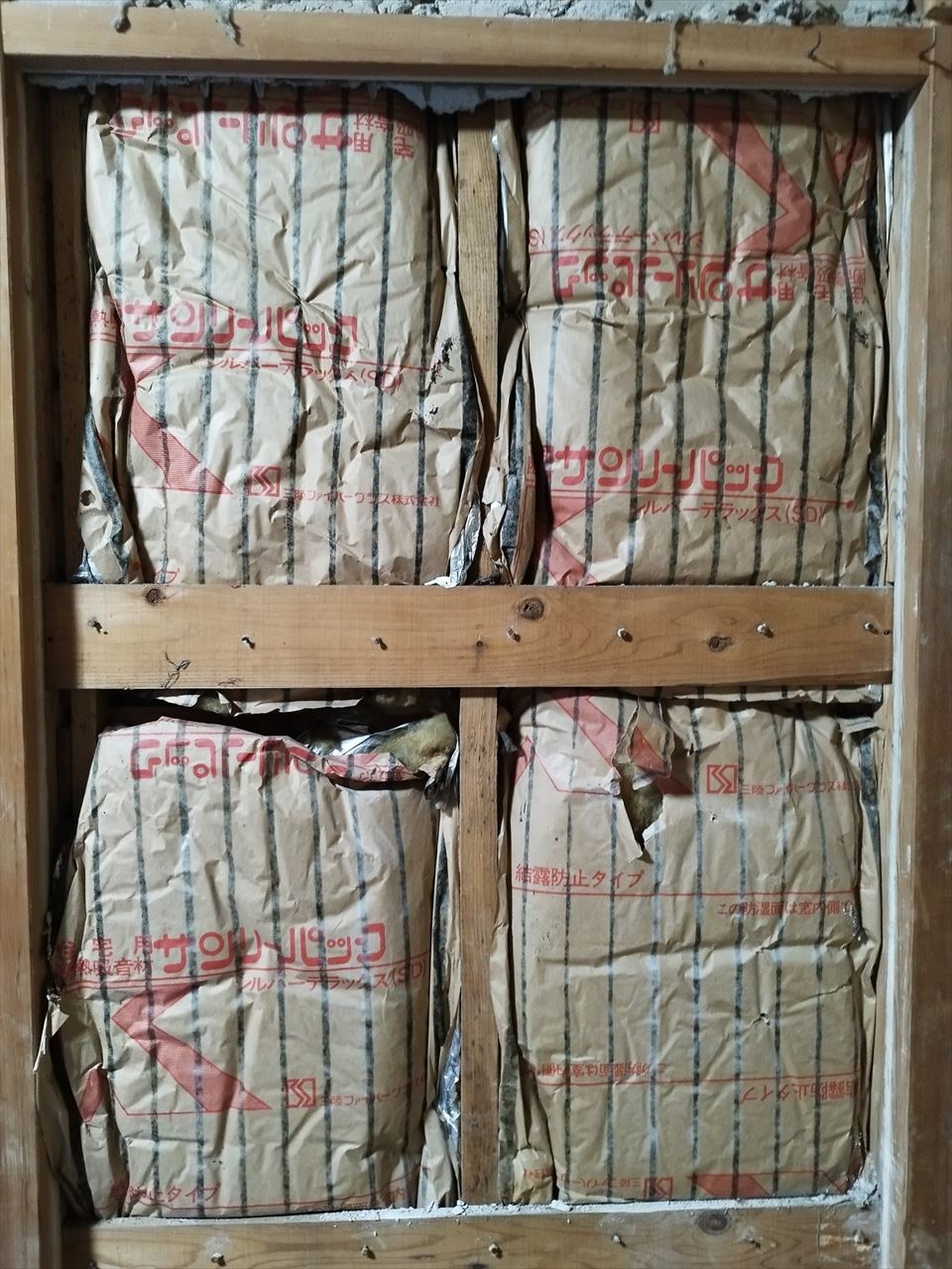外壁側の壁には、グラスウールの断熱・防音材が仕込まれていました。