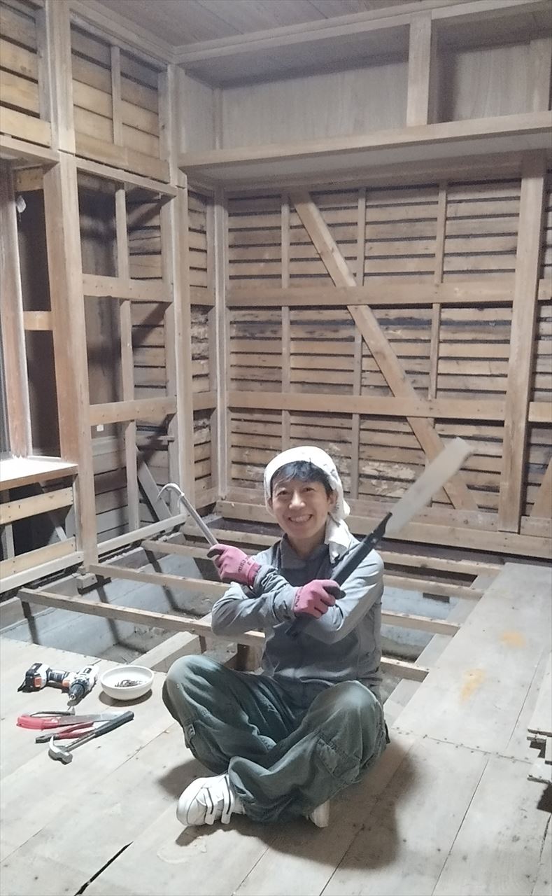 記念にと、のこぎりも持ってドヤ写真をとっていますが、実際に使っているのはバールくらいです。荒床と根太(荒床のすぐ下の角材)を固定している釘はサビて既にぼろぼろになっていて、バールでちょっと持ち上げれば簡単に剥がれます。板自体もかなり劣化していて、すぐ割れちゃうほどでした。