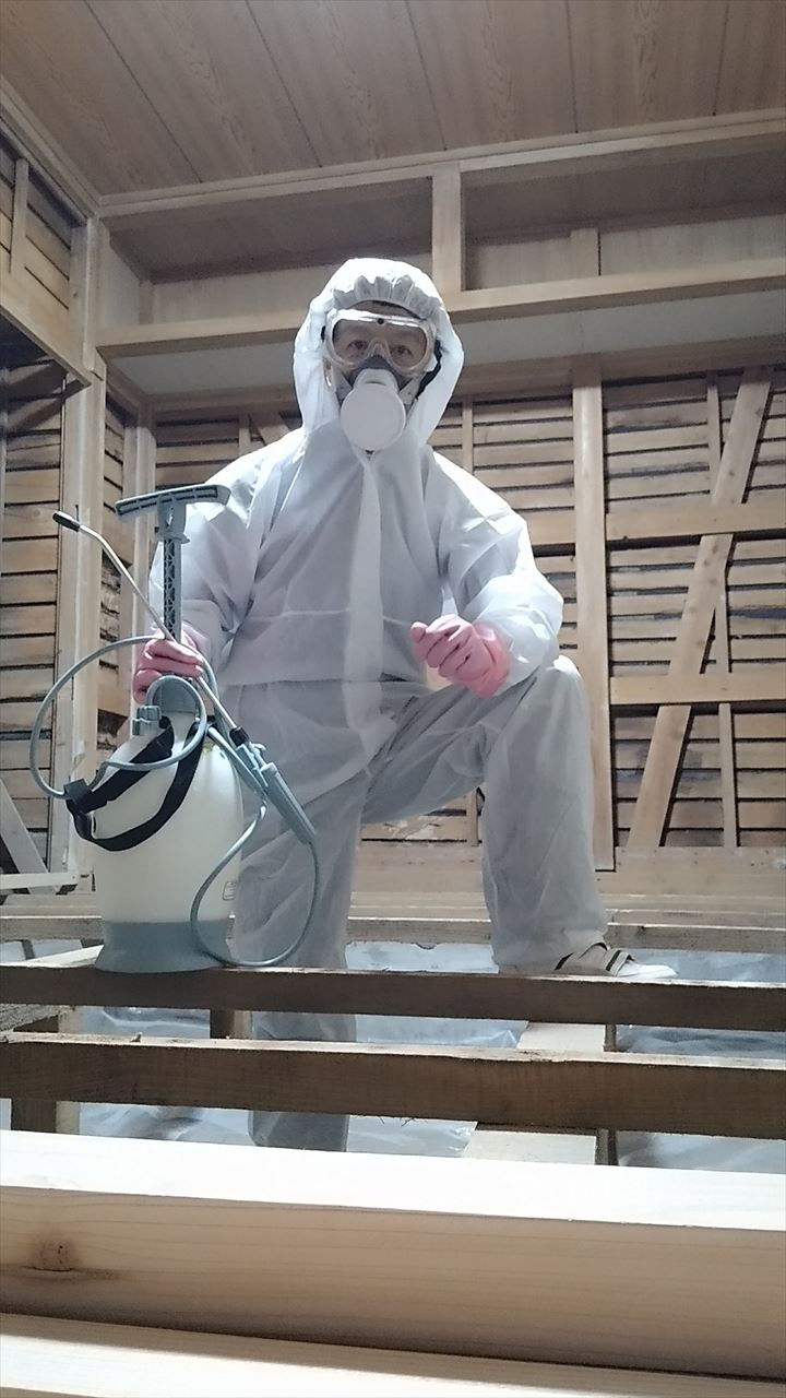 白アリミケブロックという、業者も使っているという白アリ駆除&防止剤を根太や大引(根太の下にあるより太い角材)、束材(大引と地面の間を支える木材)、あと壁の下のほうにたっぷり噴射。