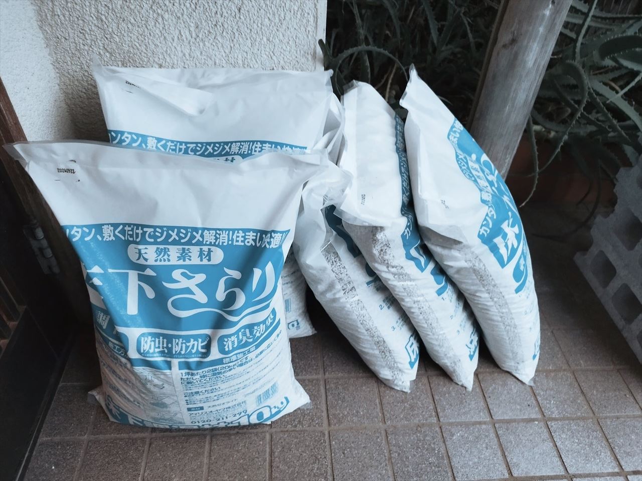 お次はアイリスオーヤマの調湿剤「床下さらり」です。Amazonで10キロ入りを6袋(6畳分)買いました。