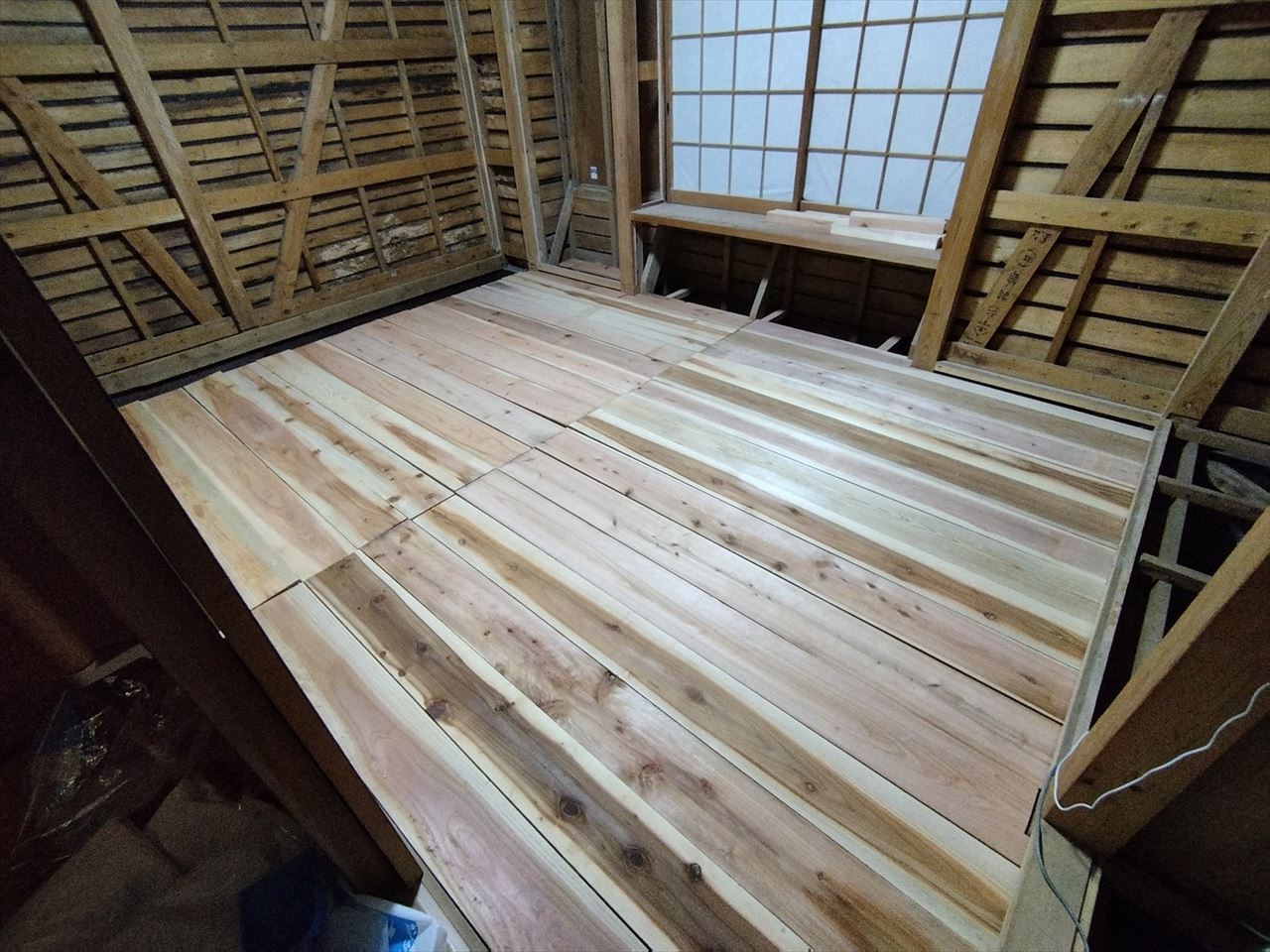 この段階では、新しく張る荒床用の杉板も購入して運び込んでいたので、これも並べて裏表、白アリミケブロック散布をしました。