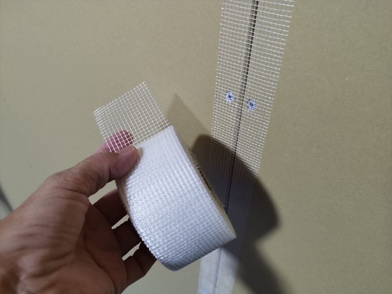 省略する人のほうが多いと思いますが、ファイバーテープを使いました。これを石膏ボードのつなぎめに貼り付けることで、石膏ボードの端を安定させ、パテのノリをよくなるのだとか。