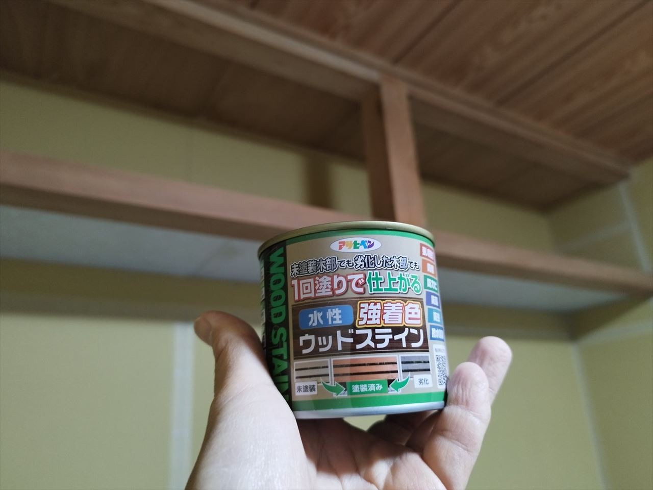 アサヒペンの水性塗料で塗ることにしました。ウォールナッツという濃い目の色です。