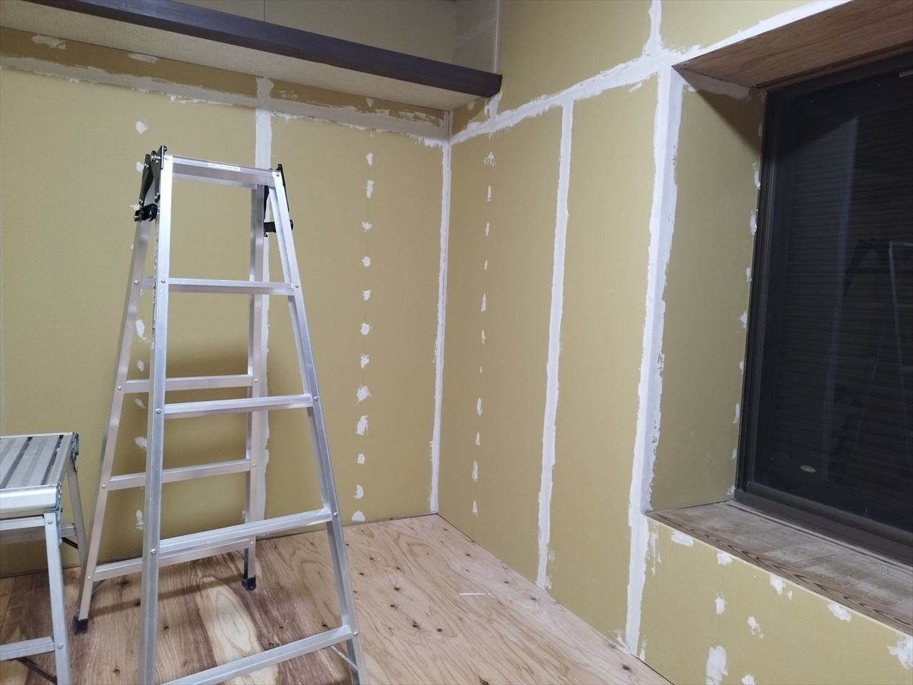 その前に、下地となる石膏ボードの表面をなるべく平らにする作業が必要です。石膏ボードのつなぎ目や、固定に使ったビスの頭が、壁紙を貼った時に表に響いてしまわないようにするためです。