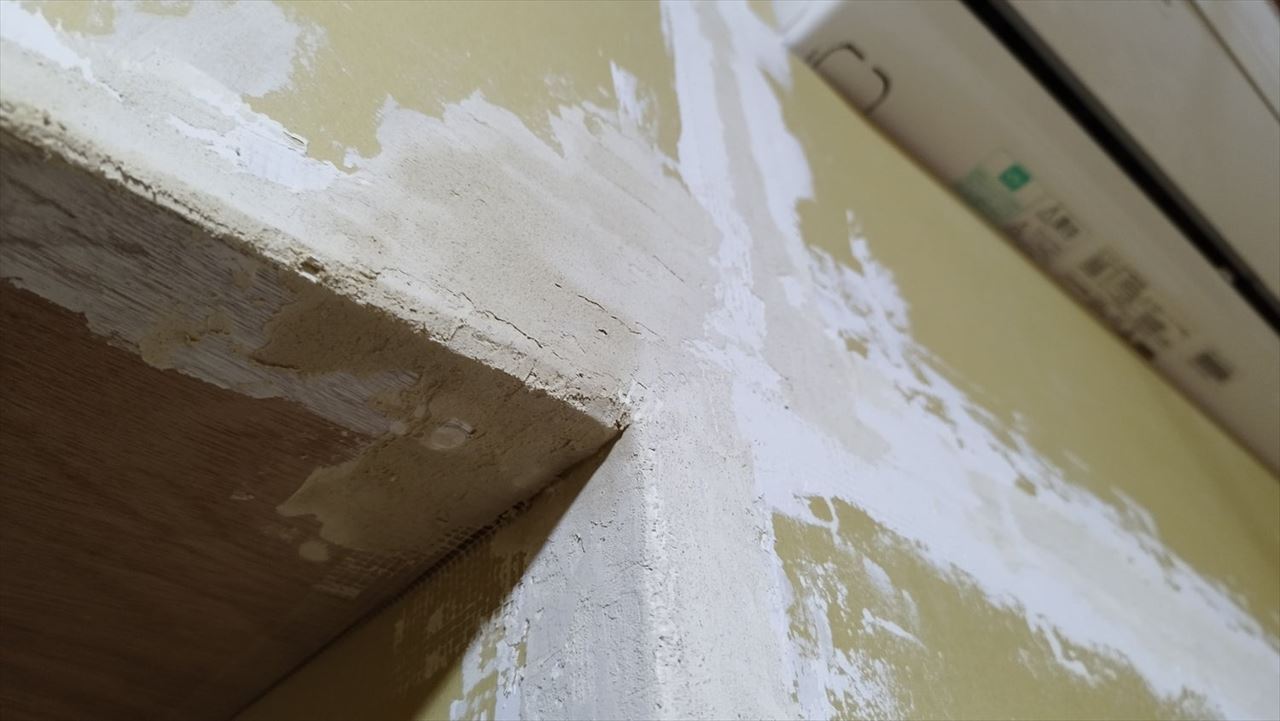 白いのがパテを塗った跡です。点線になっているところは、ビスをうった場所。ビスは石膏ボードにわずかにめり込ませていますが、そのままだと壁紙ごしにわずかな凹みが響いてしまうので、パテを塗ってまっ平らにする必要があるのです。